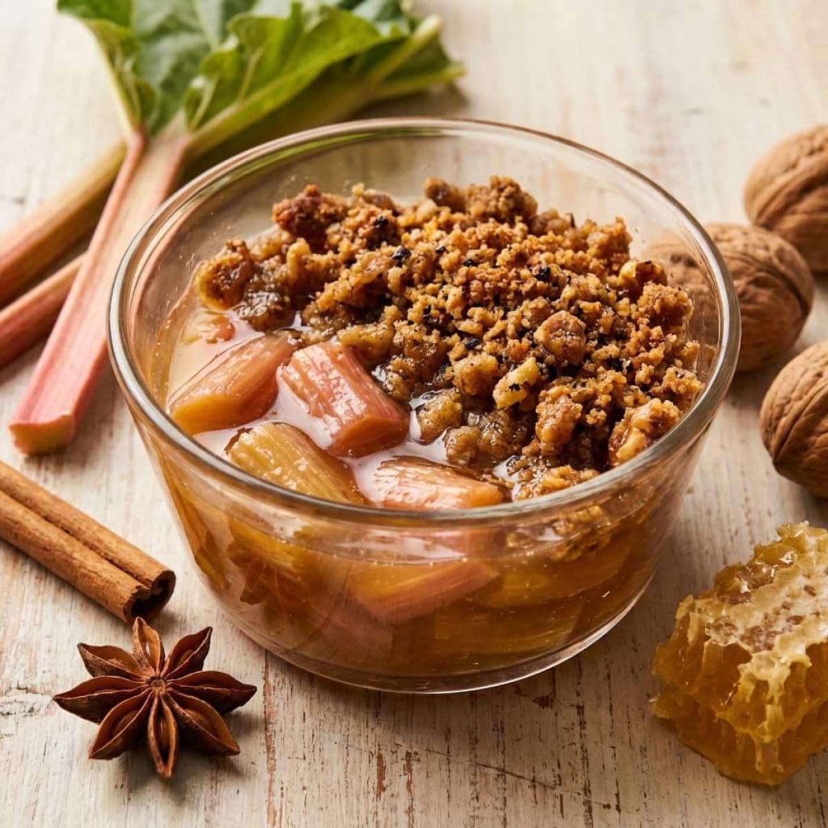 Ревень — это не только вкусный, но и очень полезный продукт. Он богат клетчаткой, витамином К, витамином С, калием и кальцием. Он также содержит антиоксиданты и обладает мягким слабительным действием. Мед — природный источник энергии и антиоксидантов. Пряности, такие как имбирь, кардамон и мускатный орех, обладают противовоспалительными и тонизирующими свойствами. Грецкие орехи — источник полезных жиров и белка. Этот десерт — отличный выбор для тех, кто следит за своим здоровьем, но не хочет отказывать себе в сладком.