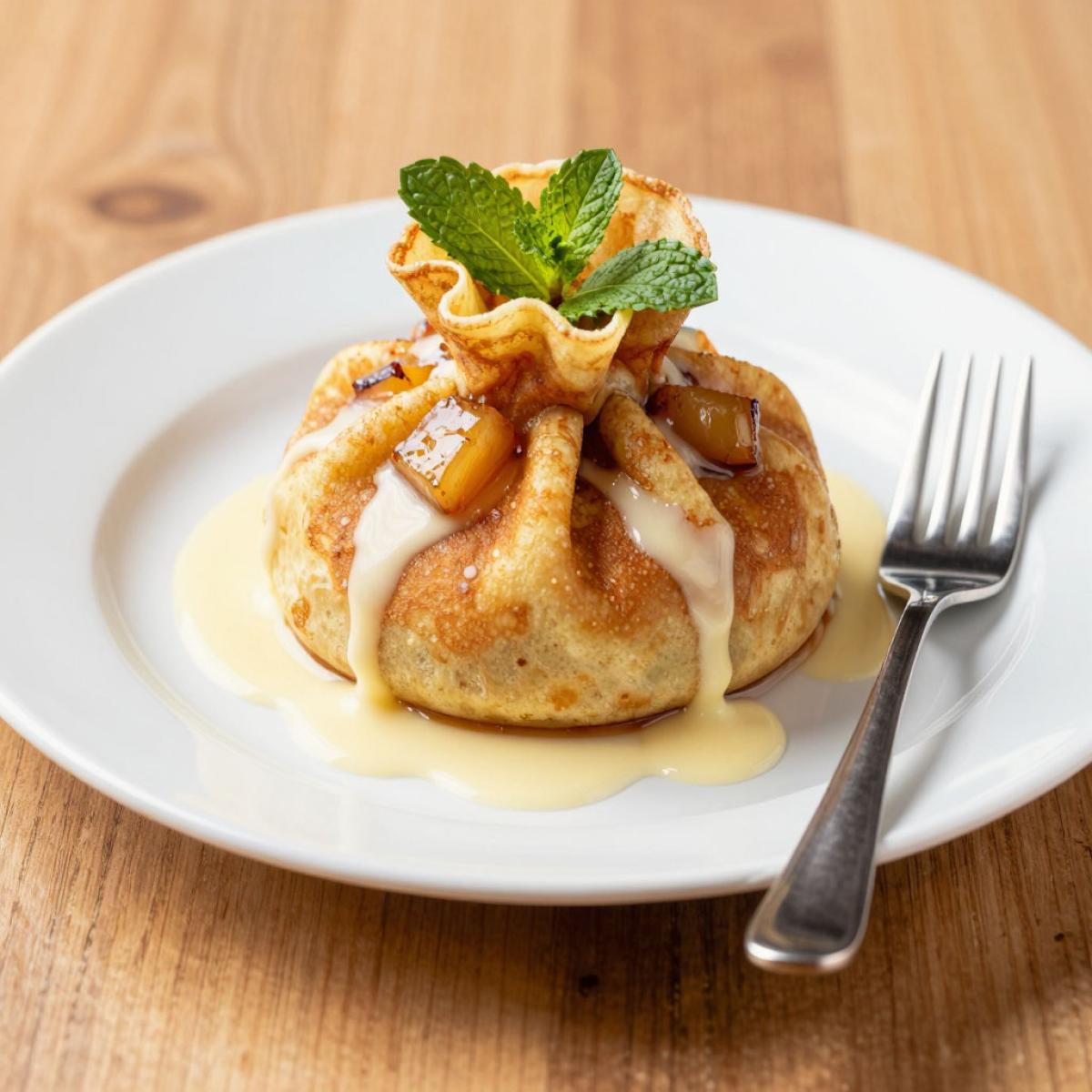 Я разделила процесс на несколько этапов. Первый - блин. Смешиваем молоко, яйца, муку. Печем блин. Второй - начинка. Фрукты мелко нарезаем, добавляем сахар, обжариваем на сливочном масле 2 минуты. Третий - сборка. Выкладываем начинку на блин. Края собираем вверху и перевязываем веточкой мяты. Четвертый - соус. Смешиваем сливки, желток, ванилин, варим на водяной бане до загустения. Пятый - подача. Поливаем мешочек соусом. Активная работа займет 20-25 минут.
