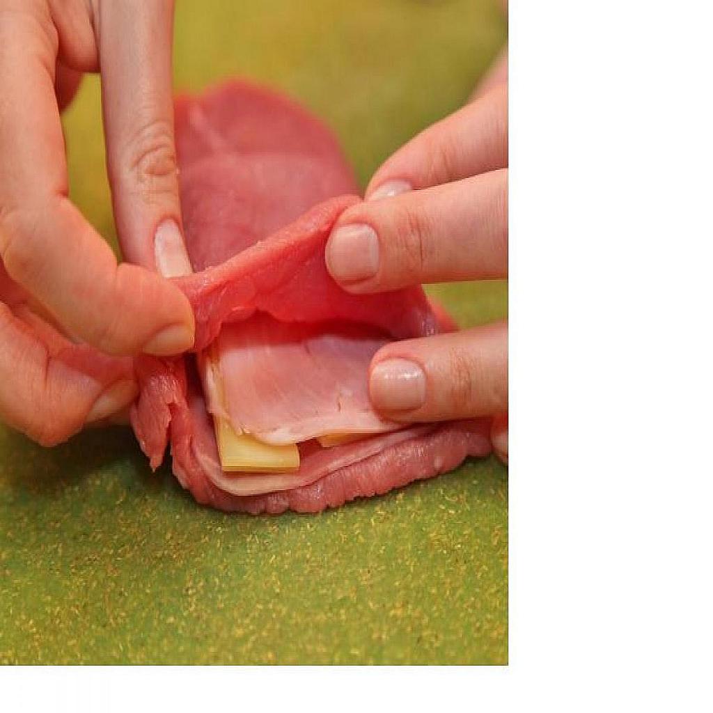 1. Вырезку нарезаем на эскалопы толщиной около 2 см. Промыть и обсушить бумажным полотенцем.2. С помощью ножа делаем отверстие внутри каждого кусочка для начинки.3. Нарезаем на одинаковые размером ломтики ветчину и сыр. Складываем пополам и кладем в середину.4. Готовый эскалоп обваливаем в муке, а потом в слегка взбитом яйце.5. Обваливаем в панировочных сухарях и сразу на горячую сковороду. Жарим на сливочном масле около 15 минут с обеих сторон.6. Подаем к столу горячими! Приятного аппетита!