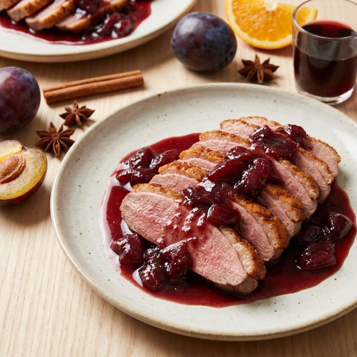 Утка — это мясо с характером. Оно жирное, сочное и невероятно вкусное, если знать, как его правильно приготовить. Сегодня я предлагаю вам рецепт, который превратит утиные грудки в настоящий кулинарный шедевр. Это упрощенный, но не менее изысканный вариант традиционного английского блюда — утиные грудки в сливовом соусе. Представьте: нежное, сочное мясо утки с хрустящей, карамелизированной кожицей, которое буквально тает во рту, и изысканный, кисло-сладкий соус из слив с вином, апельсином и клюквенным джемом. Этот соус — настоящая симфония вкуса, где сливы, вино, апельсин и пряности создают идеальный баланс, подчеркивающий и дополняющий богатый вкус утки. Это блюдо — идеальный выбор для праздничного ужина, романтического вечера или любого другого особого случая. Готовить его не очень сложно, но важно соблюдать несколько ключевых правил, особенно при обжаривании утки. Я подробно расскажу вам о всех этапах, чтобы у вас получились идеальные утиные грудки в сливовом соусе.
