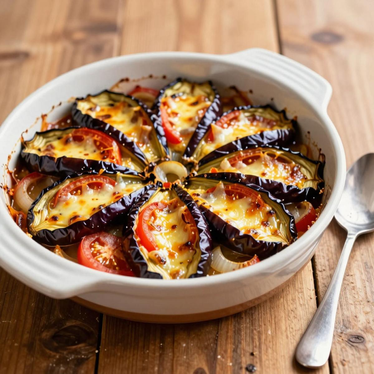 Баклажаны - источник клетчатки, калия. Помидоры - ликопин. Сыр - кальций. Чеснок - аллицин. Блюдо калорийное (примерно 250-300 ккал на порцию).
