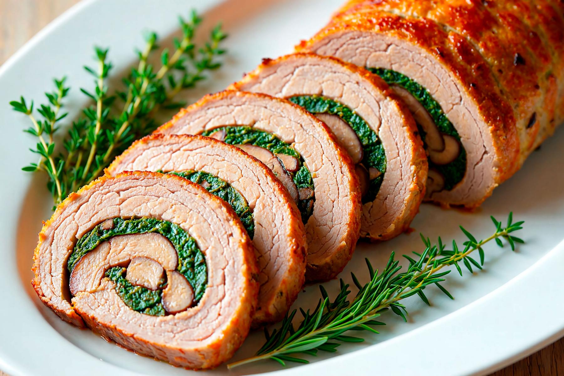 Подача рулета — это его звездный час. Выложите целые рулеты на большое блюдо, украсьте веточками петрушки и укропа, дольками помидоров или огурцов. Рядом можно разместить гарнир. Идеальный гарнир к рулету — картофельное пюре, отварной рис, запеченные овощи или легкий салат из свежей зелени. Но самый эффектный вариант — нарезать рулет ломтиками толщиной 1,5-2 см и выложить их на тарелку, демонстрируя красивый спиралевидный срез с зеленой начинкой. Полить сверху соком, образовавшимся при запекании, или любым любимым соусом (сметанным, сливочным, томатным). Это блюдо идеально для фуршета: его удобно есть вилкой, и оно всегда привлекает внимание.