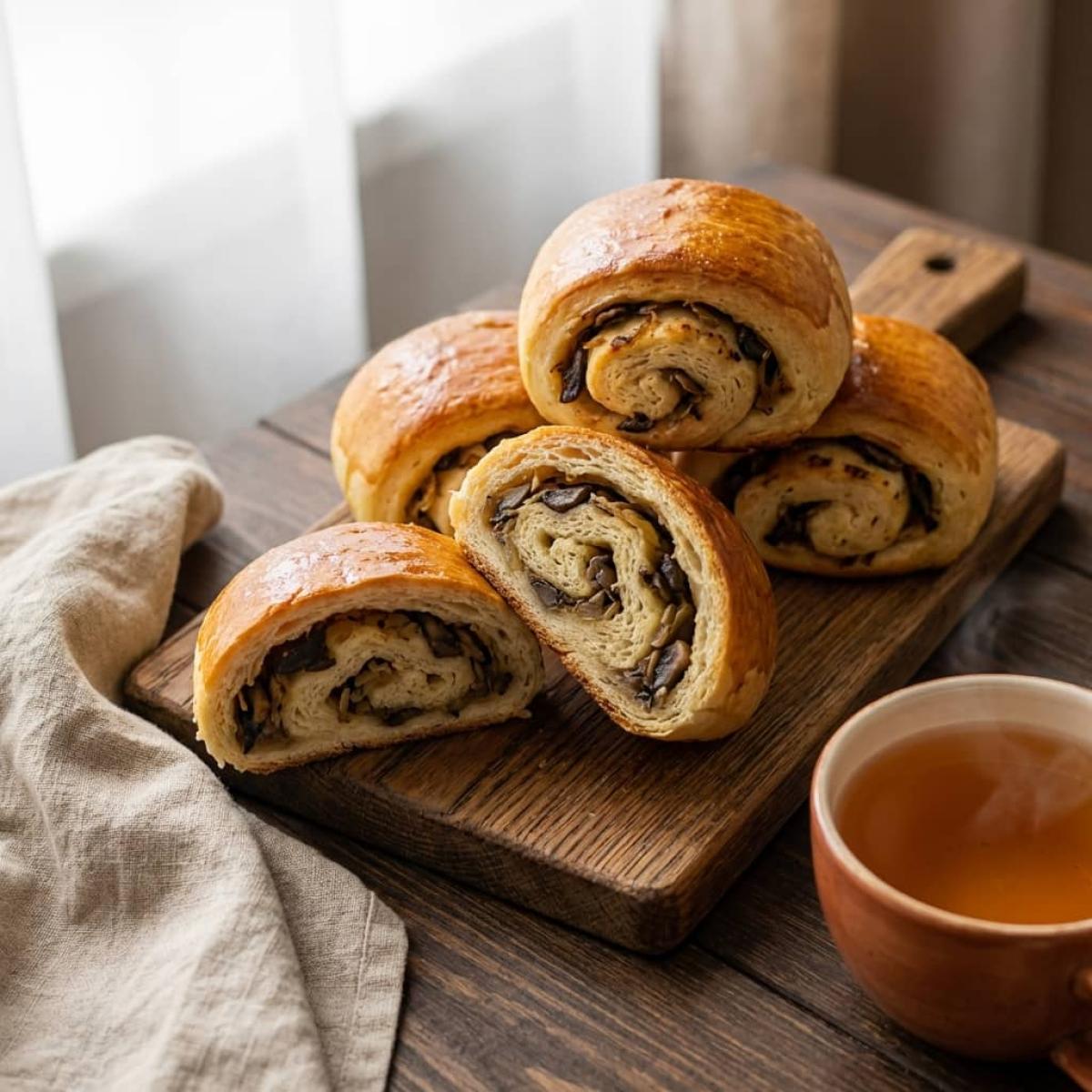 Грибные рулетики лучше всего хранить при комнатной температуре, завернутыми в чистое кухонное полотенце или в бумажном пакете. В полиэтиленовом пакете они могут отсыреть и потерять хрусткость корочки. В таком виде они остаются свежими 2-3 дня. В холодильнике они хранятся дольше (до 5-7 дней), но текстура может стать более плотной. Перед подачей холодные рулетики можно слегка разогреть в духовке при 150°C в течение 10 минут - они снова станут мягкими и ароматными. Также рулетики отлично поддаются заморозке. Замораживайте их в сыром виде (после второй расстойки) или уже готовыми. Сырые замороженные рулетики можно выпекать без размораживания, увеличив время выпечки на 10-15 минут. Готовые замороженные рулетики разогревайте в духовке. Заморозка позволяет всегда иметь под рукой домашнюю выпечку к чаю или к супу.