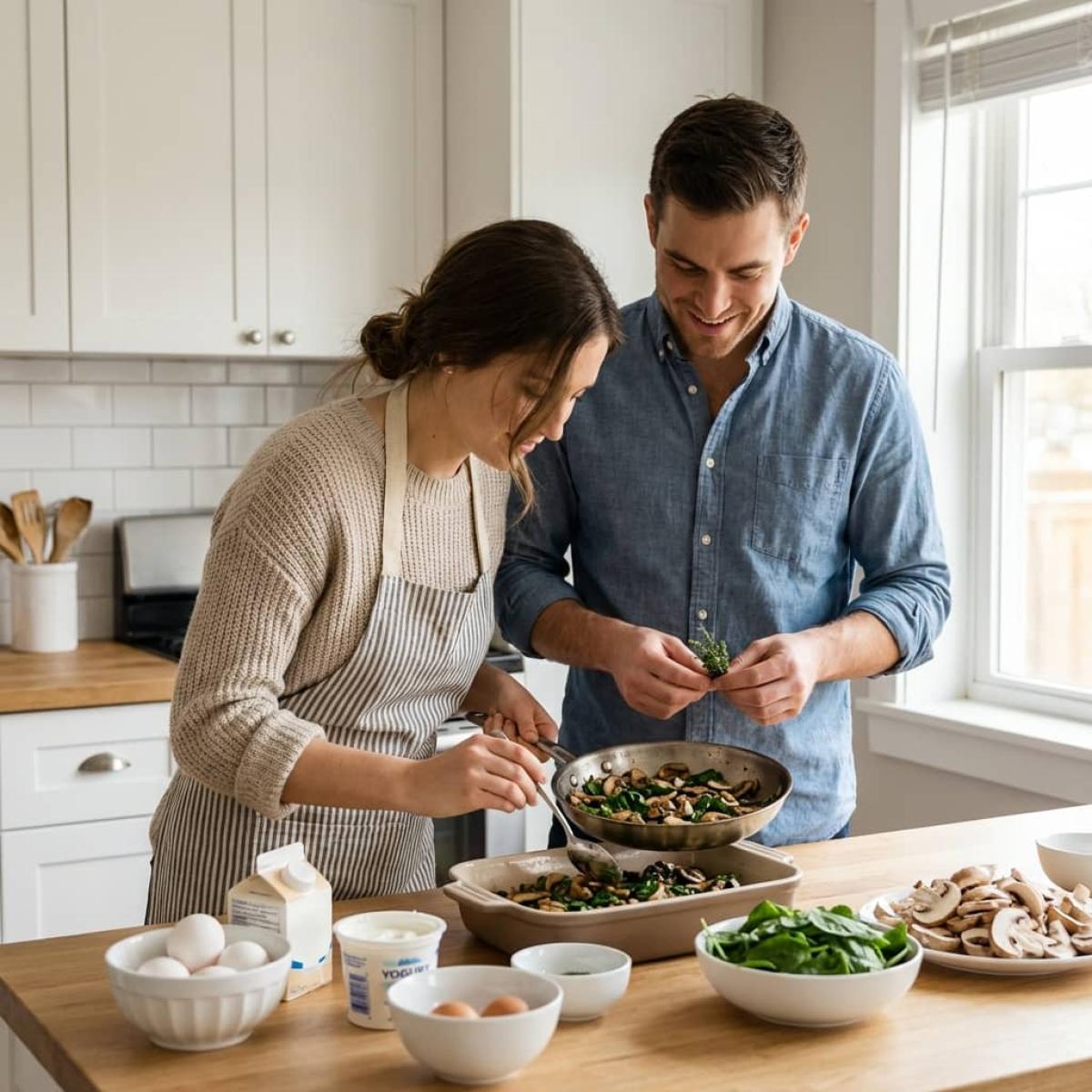 Киш со шпинатом и грибами - это легкое, но питательное блюдо. Шпинат богат железом, витаминами А, С, К, фолиевой кислотой и антиоксидантами. Он полезен для зрения, кожи и кроветворения. Грибы - источник растительного белка, витаминов группы В и селена. Лук содержит фитонциды, поддерживающие иммунитет. Яйца - полноценный белок, витамин D и холин. Сливки и йогурт добавляют кальций и полезные жиры. В этом блюде нет теста, поэтому оно менее калорийно, чем традиционный киш. Оно подходит для тех, кто следит за фигурой, для вегетарианцев (если использовать растительный йогурт) и для тех, кто придерживается здорового питания. Регулярное употребление шпината и грибов способствует укреплению иммунитета и улучшению общего состояния организма.