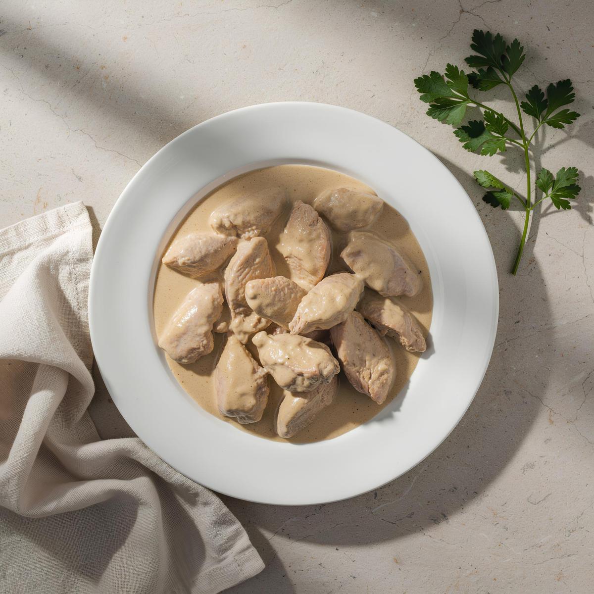 Фрикасе из куриного мяса — это блюдо, которое для меня олицетворяет французский шарм и домашний уют одновременно. Нежнейшее белое мясо, тушеное в бархатистом сливочном соусе с легким ароматом мускатного ореха, тает во рту, оставляя послевкусие настоящего гастрономического удовольствия. Я помню, как впервые попробовала это блюдо в маленьком парижском бистро: оно было подано с рисом и свежими овощами, и это было так просто, но так изысканно. Сегодня я поделюсь с вами рецептом этого замечательного блюда. Фрикасе готовится очень просто, но требует внимания к деталям. Мы будем использовать куриную грудку — она диетическая и быстро готовится. Сливочный соус на основе сливок с мускатным орехом придает блюду нежность и благородный вкус. Это блюдо из французской кухни, оно не острое, с насыщенным, сливочным вкусом. Идеально для обеда или ужина.