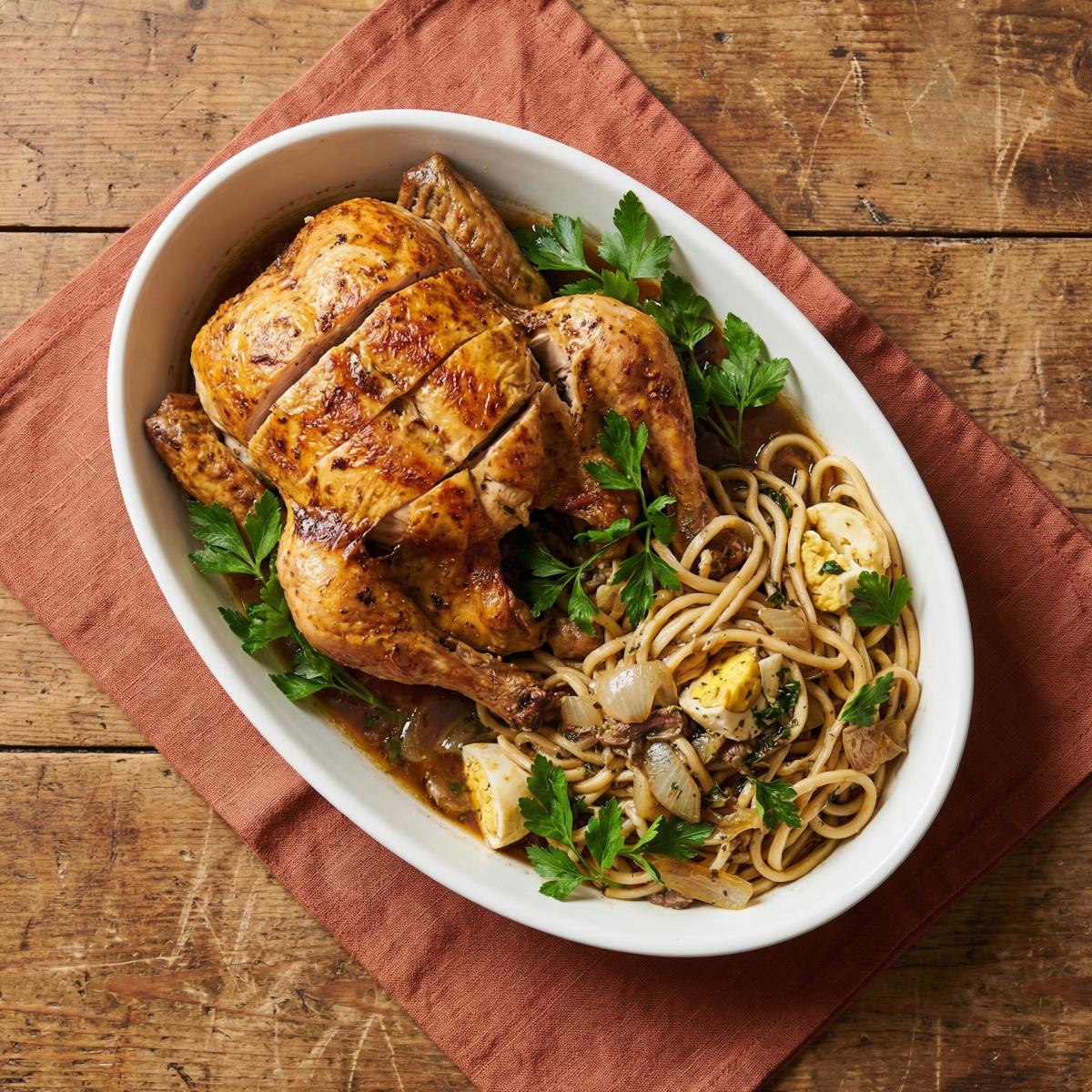 Курица с лапшевником - это блюдо, которое я открыл для себя совершенно случайно, и теперь оно прочно вошло в мой список любимых рецептов для семейного ужина. На первый взгляд, сочетание курицы и макарон может показаться необычным, но именно этот дуэт создает удивительную гармонию: нежное, сочное куриное мясо и ароматная, сытная начинка из лапши с луком и яйцом. Это блюдо - настоящая находка для тех, кто любит экспериментировать и хочет удивить близких новым, но при этом простым способом приготовления курицы. Внутри курица получается сочной, а начинка пропитывается мясными соками, становясь невероятно вкусной. В этом рецепте я расскажу, как правильно подготовить курицу для фаршировки, как приготовить начинку, чтобы она не выпадала, и как запечь курицу, чтобы она получилась румяной и сочной.