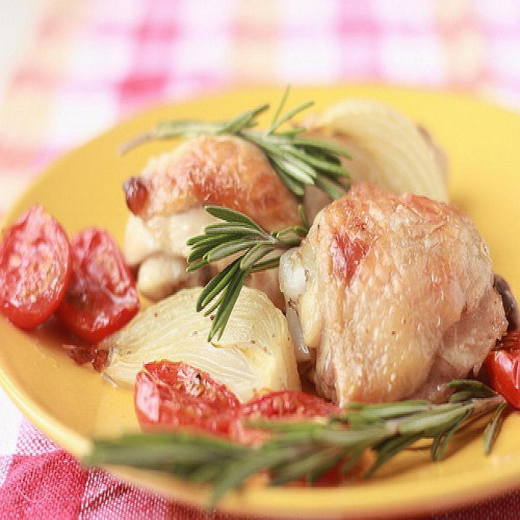 По данному рецепту можно приготовить куриную тушку целиком или отдельные её части. Суть рецепта - в винном маринаде, который придает куриному мясу особенный вкус.Подготовленные куски курицы поместить в глубокую посуду.Подготовить остальные компоненты:- лук разобрать на перья или крупно нарезать- чеснок выдавить через пресс- розмарин помыть и разделить на веточкиВ посуду с курицей влить вино и добавить все остальные ингредиенты. Оставить для маринования на 4-5 часов. Временами курицу переворачивать разными сторонами, чтобы она равномерно пропиталась маринадом.Форму для запекания смазать растительным маслом и уложить куски курицы. В промежутках плотно уложить помидоры черри, нарезанные половинками (сколько поместится) + маринованные перья лука.Сбрызнуть оливковым маслом, посолить и приправить смесью специй.Запекать в духовке 40-50 мин. при температуре 200 гр.