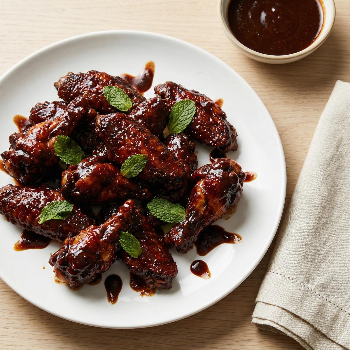 - 5. Подача: Готовые крылышки выкладываем на блюдо. Поливаем оставшимся соусом. Украшаем свежими листьями мяты. Подаем горячими.