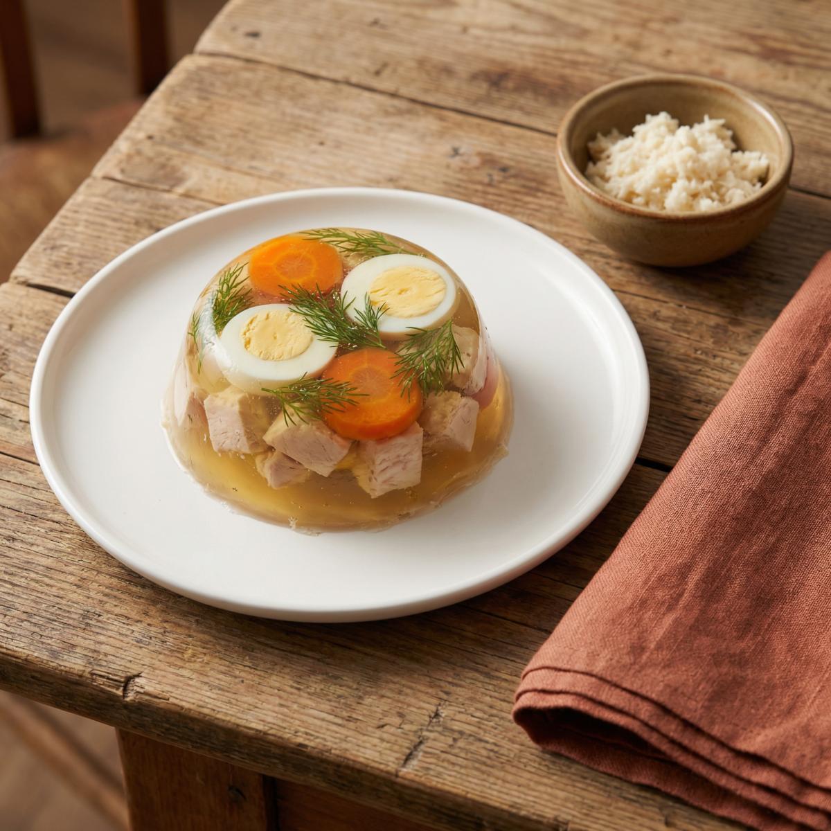 - 10. Подача: Перед подачей форму с холодцом на несколько секунд опускаем в горячую воду, затем переворачиваем на блюдо. Украшаем свежей зеленью. Подаем с хреном, горчицей или уксусом.