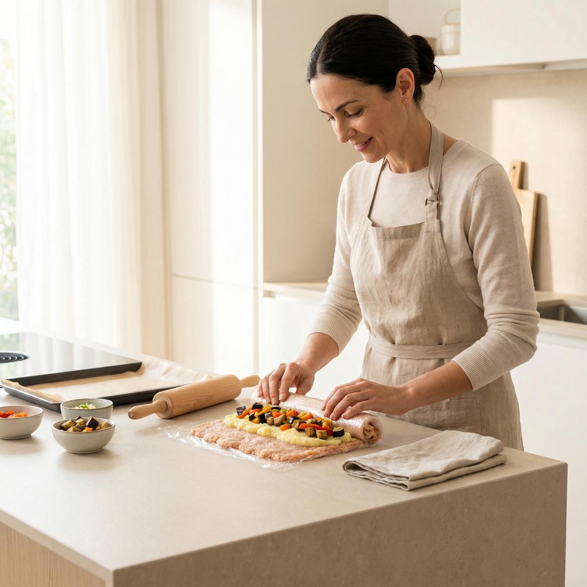 Идея слоеных рулетов из мяса и овощей имеет давнюю историю в европейской кухне. Во Франции это террины и паштеты, в Италии — "запеченные рулеты", в Германии — "ролладен". В советской кулинарии такие блюда появились как способ красиво и празднично подать привычные продукты. Куриный фарш, картофель, овощи — все это было доступно, а при правильном сочетании давало изысканный результат. Формирование рулета с помощью пищевой пленки — это современная техника, которая упрощает процесс и делает его доступным для домашних поваров. Сегодня куриный рулет с овощами — это популярное блюдо для праздничного стола. Его ценят за красивый вид, возможность приготовить заранее (в холодном виде он даже вкуснее) и за то, что в нем сочетаются и мясо, и гарнир. Это блюдо — пример того, как из простых ингредиентов можно создать настоящий кулинарный шедевр.