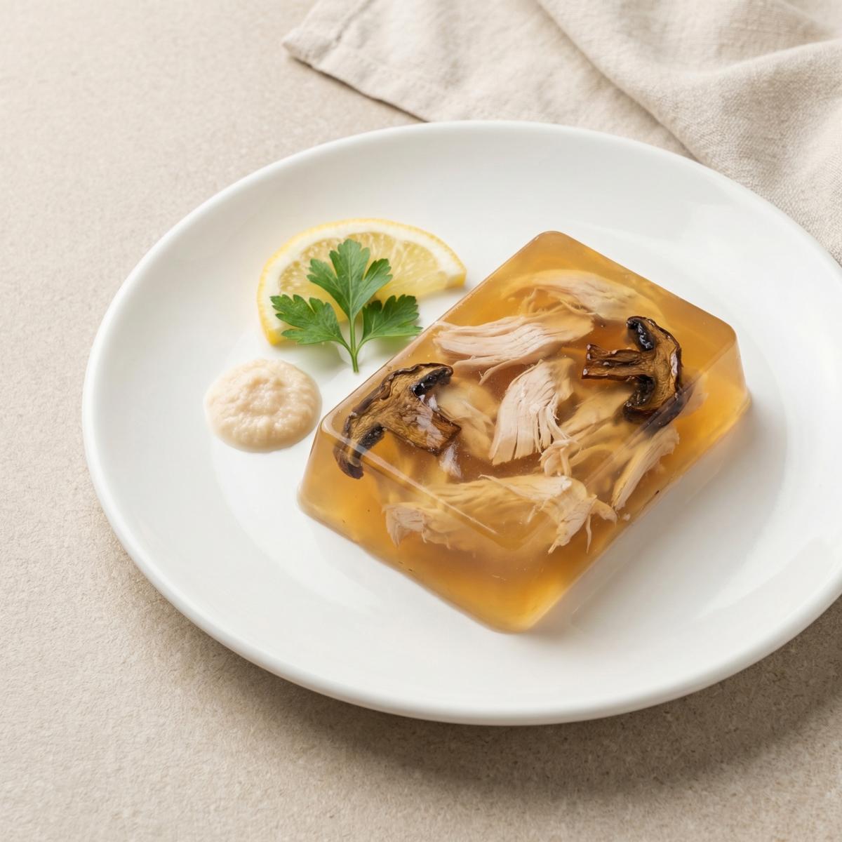 Куриный заколот — блюдо парадное, и подавать его нужно соответственно. Самый элегантный вариант — порционная подача в стеклянных креманках или кокотницах. Перед подачей опустите форму на несколько секунд в горячую воду, накройте тарелкой и переверните — у вас получится аккуратный, дрожащий холмик студня. Украсьте каждую порцию веточкой свежей зелени (петрушка, укроп), ломтиком отварной моркови, фигурно вырезанным из яйца, или долькой лимона. Традиционный соус к заливному — русский хрен (столовый хрен со свеклой или сметаной) или горчица. Они оттеняют нежный вкус курицы и грибов своей остротой. Подавайте заколот хорошо охлажденным, но не ледяным. Идеальные напитки — охлажденная водка, крепкая горькая настойка или сухое белое вино. Это блюдо задает тон всему застолью, намекая на то, что сегодня праздник.