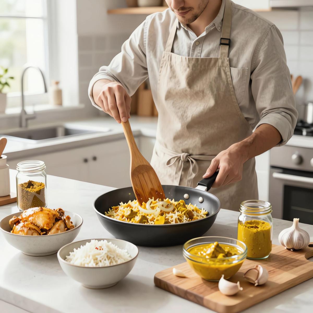 Приготовление риса с курицей и карри можно разделить на несколько этапов. Первый — обжарка курицы. Филе нарезается и обжаривается до золотистой корочки, затем откладывается. Второй — приготовление основы. На той же сковороде обжаривается лук до прозрачности, добавляется чеснок и карри, затем — промытый рис. Все вместе обжаривается одну минуту. Третий — варка. Содержимое сковороды перекладывается в кастрюлю с бульоном, доводится до кипения и варится под крышкой до готовности риса. Четвертый — финальный этап. За 5 минут до готовности в рис добавляется обжаренная курица. Блюдо получается немного острым, с насыщенным ароматом карри, рассыпчатым рисом и нежной курицей.