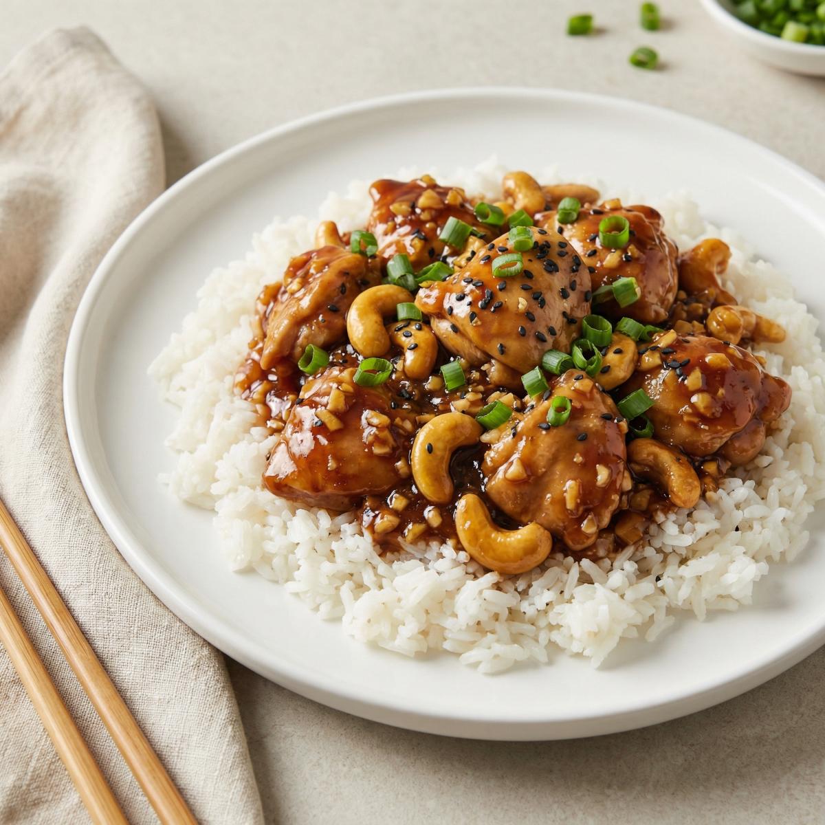 Рис с курицей и кешью под азиатским соусом — это блюдо, которое переносит меня в уютные уличные кафе Бангкока или маленькие ресторанчики в Шанхае. Аромат чеснока, имбиря и соуса хойсин, смешанный с хрустящими орешками кешью и нежной курицей, создает ту самую магию, за которую мы так любим азиатскую кухню. Это блюдо готовится быстро, выглядит ярко и всегда вызывает восхищение. Сегодня я поделюсь с вами рецептом этого замечательного блюда. Мы будем использовать куриное филе, обжаренное с чесноком и орехами кешью, а затем тушенное в соусе на основе крахмала, соуса хойсин и уксуса. Подается это все с отварным рисом, посыпанное зеленым луком. Блюдо из китайской кухни, оно получается немного острым, с насыщенным, пряным вкусом и интересной текстурой. Идеально для обеда или ужина.