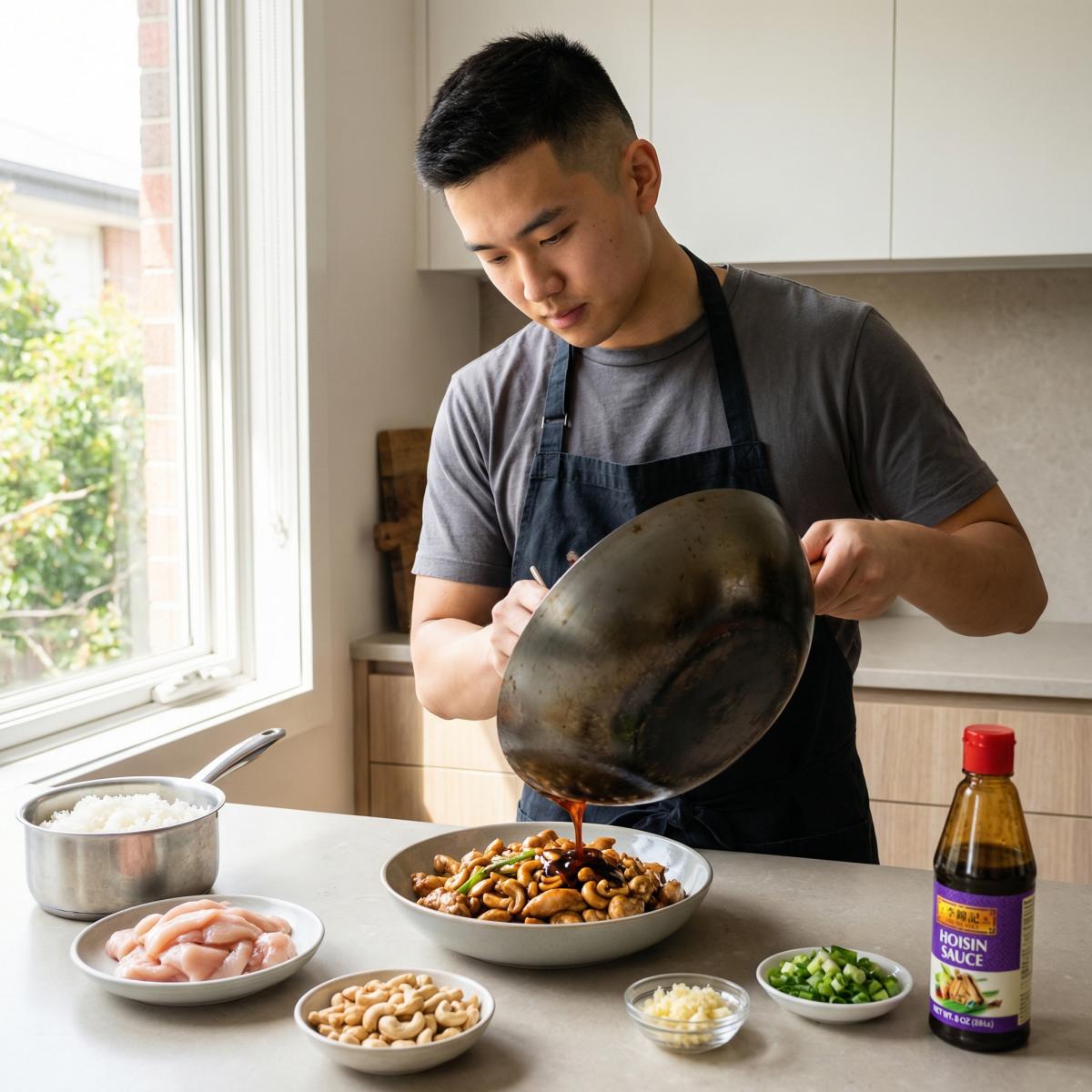 Приготовление риса с курицей и кешью можно разделить на несколько этапов. Первый — варка риса. Рис отваривается по инструкции на упаковке. Второй — обжарка орехов и чеснока. На сковороде разогревается масло, обжариваются орехи кешью и чеснок до золотистого цвета. Третий — обжарка курицы. Мелко нарезанная курица добавляется к орехам и обжаривается до почти готовности. Четвертый — приготовление соуса. В отдельной емкости смешиваются вода (или бульон), крахмал, соус хойсин и уксус. Эта смесь добавляется к курице и варится до загустения. Пятый — подача. Курица с соусом выкладывается на рис, посыпается зеленым луком. Блюдо получается немного острым, с насыщенным вкусом, хрустящими орешками и нежной курицей.