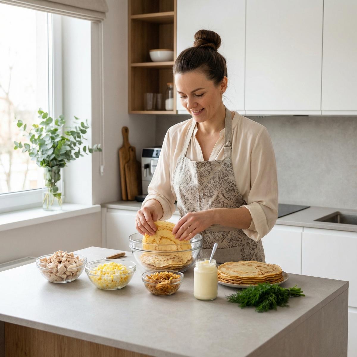 Салат куриный с блинами — это блюдо, которое я помню с детства. Моя бабушка часто готовила его на праздники, и он всегда был одним из первых, исчезающих со стола. Сочетание нежных домашних блинов, сочной курицы, мягких яиц и ароматного жареного лука, заправленное майонезом, создает удивительную гармонию вкусов и текстур. Этот салат — настоящая находка для тех, кто любит сытные, но при этом не слишком тяжелые блюда. Он красиво смотрится, готовится из доступных продуктов и всегда вызывает восхищение. Сегодня я поделюсь с вами рецептом этого замечательного салата. Мы будем использовать домашние блины (их можно испечь заранее), отварную курицу, вареные яйца и жареный лук. Все ингредиенты нарезаются, смешиваются и заправляются майонезом. Это блюдо из русской кухни, оно не острое, с насыщенным, домашним вкусом. Идеально для праздничного стола или семейного ужина.
