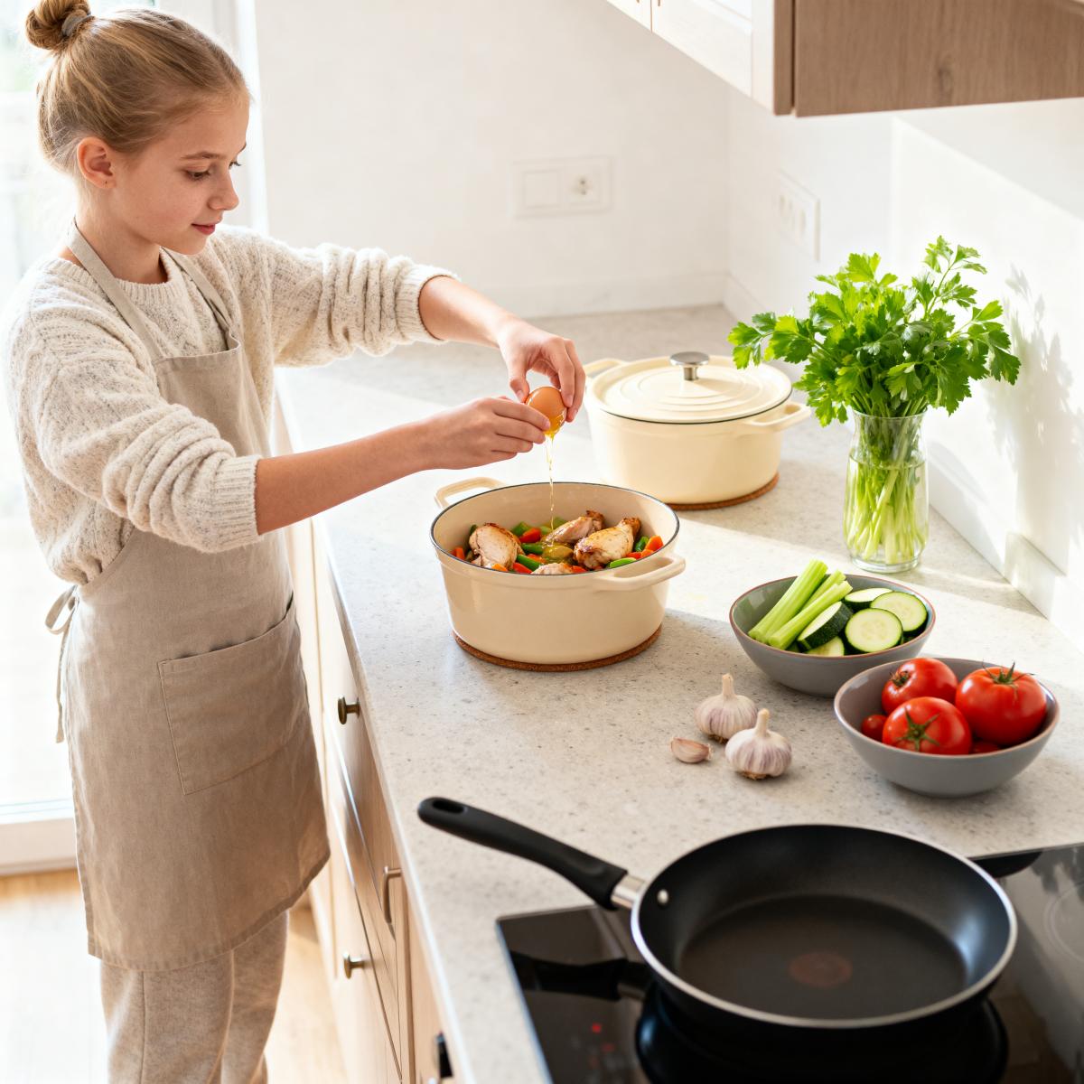 Яйца, запеченные с овощами и куриным мясом — это блюдо, которое превращает обычный завтрак в настоящий праздник вкуса. Представьте себе: ароматный горшочек, в котором на слое сочной курицы и овощей покоятся яйца с нежным, слегка тягучим желтком. Это не просто еда, это утренний ритуал, который заряжает энергией и хорошим настроением на весь день. Я часто готовлю это блюдо в выходные, когда есть время побаловать себя и близких чем-то особенным. Оно не требует сложных навыков, готовится быстро, а выглядит очень эффектно. Сегодня я поделюсь с вами рецептом, который позволяет варьировать ингредиенты по вашему вкусу. Мы будем использовать куриное мясо (можно взять отварное или обжаренное), кабачок, сельдерей, помидоры и чеснок. Все это выкладывается в горшочек, сверху вбиваются яйца, и блюдо отправляется в духовку. Блюдо из международной кухни, оно не острое, с нежным, насыщенным вкусом. Идеально для завтрака или легкого ужина.