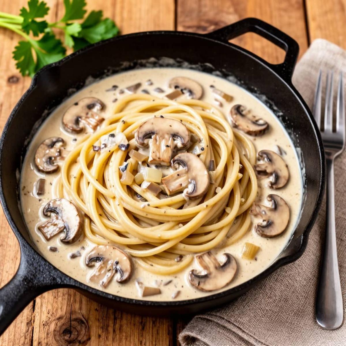 - 8. Настаивание. Плотно накрываем сковороду крышкой, выключаем огонь и оставляем на 10-15 минут. За это время макароны впитают почти весь соус и станут мягкими, пропитанными грибным ароматом.