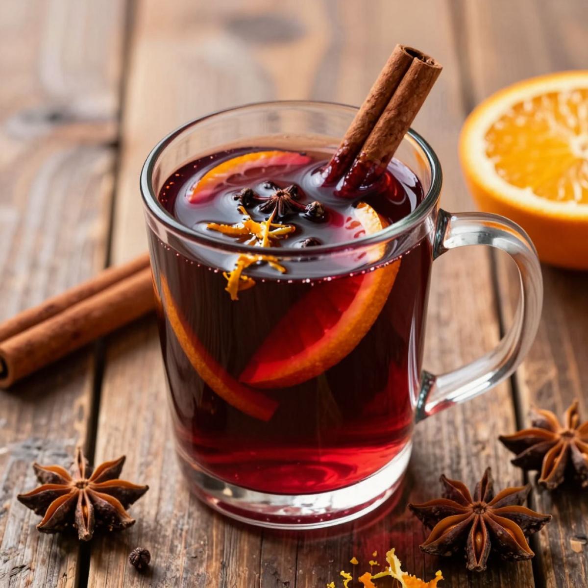 Подавайте в толстостенных бокалах или кружках. Украсьте долькой апельсина, палочкой корицы.