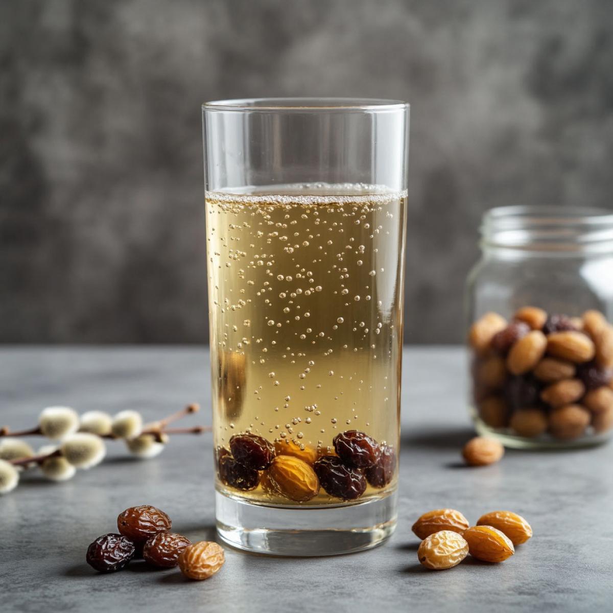 - 3. Заливка и добавление ингредиентов. Налейте в банку процеженный березовый сок. Добавьте сахар (если используете) и горсть немытого изюма. Если готовите вариант без сахара, добавьте 300 г сухофруктов (чернослива и/или кураги).