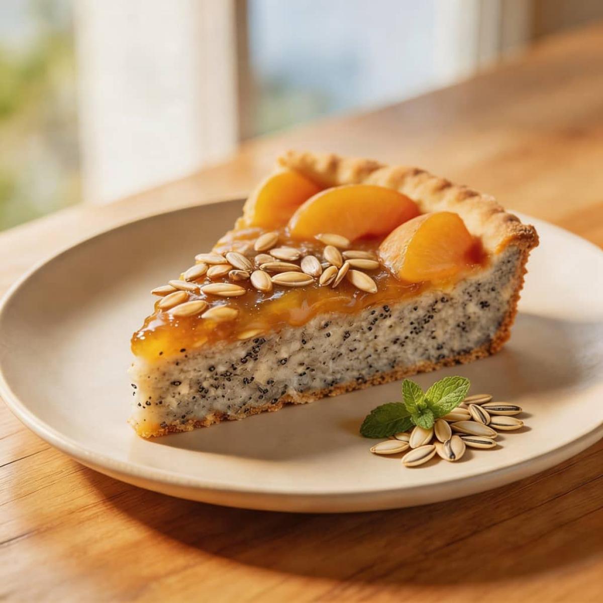 - 11. Финальная выпечка. Возвращаем пирог в духовку (все еще разогретую до 180°C) еще на 10 минут. За это время верхушка (семечковая масса) должна слегка зарумяниться и стать глянцевой, а персики прогреются.