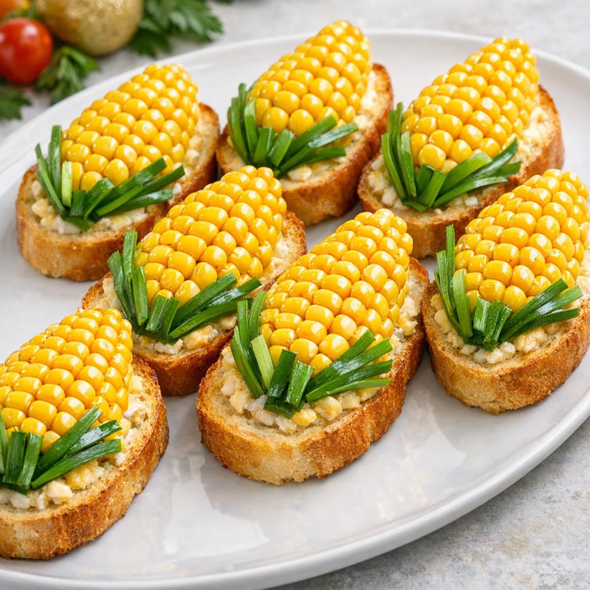 • Зелень: Классика — перья зеленого лука, разрезанные вдоль для имитации листьев кукурузы. Также подойдет укроп, петрушка или даже несколько листиков рукколы для пикантности.
