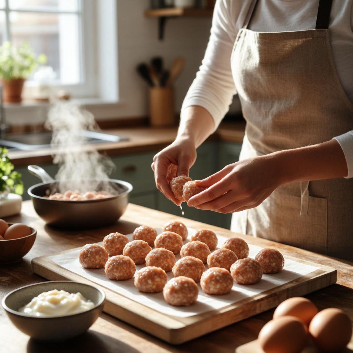 - 3. Формирование фрикаделек. В миску с куриным фаршем добавьте яйцо и щепотку соли. Тщательно вымешайте массу до однородности и лёгкой липкости. Смочите руки в холодной воде и сформируйте небольшие шарики диаметром около 1,5-2 см. Фрикадельки не должны быть слишком крупными, чтобы они быстро и равномерно проварились.