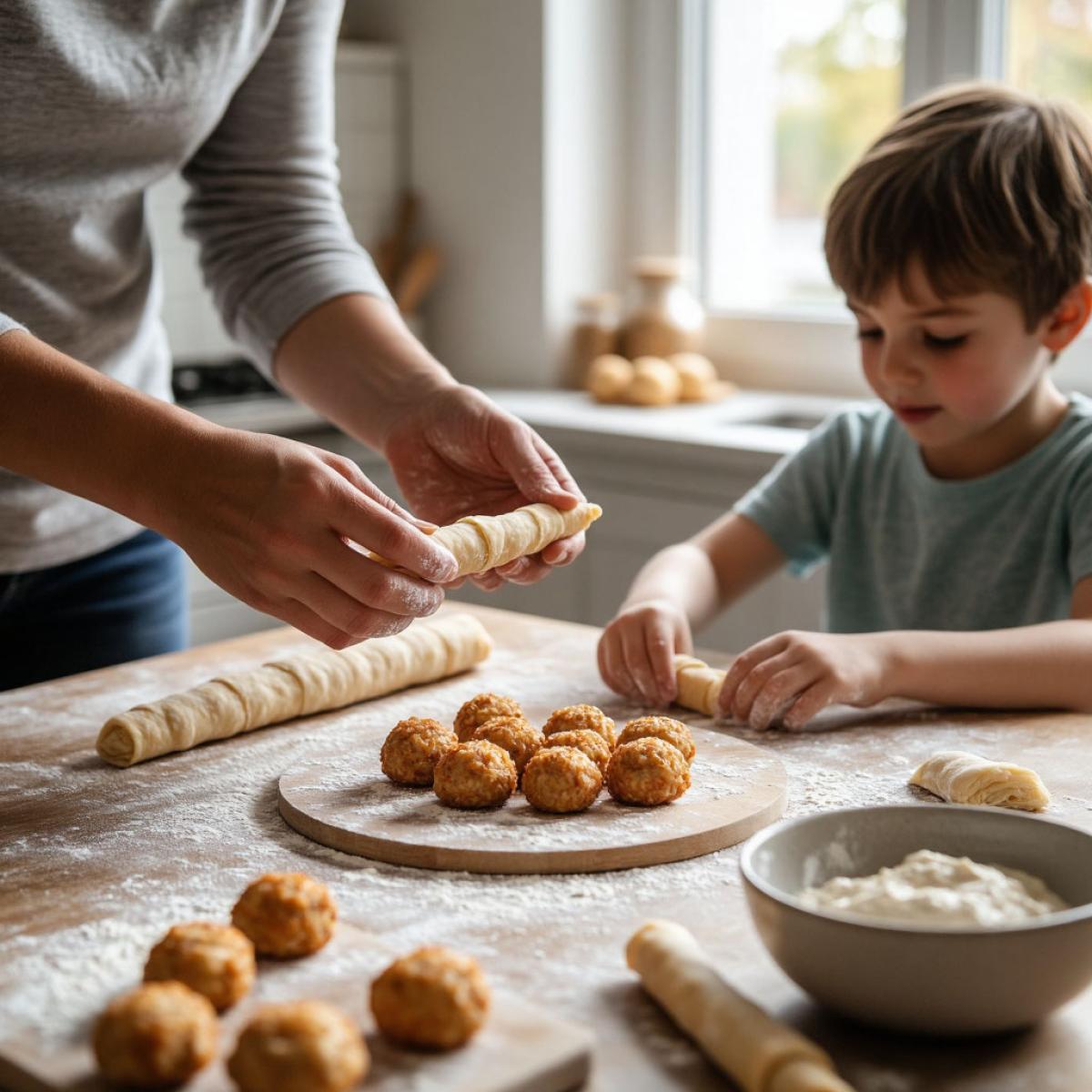 - Детский кулинарный мастер-класс: Эта закуска — идеальный повод привлечь детей к готовке. Процесс лепки шариков и их обматывания тестом развивает мелкую моторику, чувство формы и доставляет массу удовольствия. А съесть потом собственное творение — двойная радость.