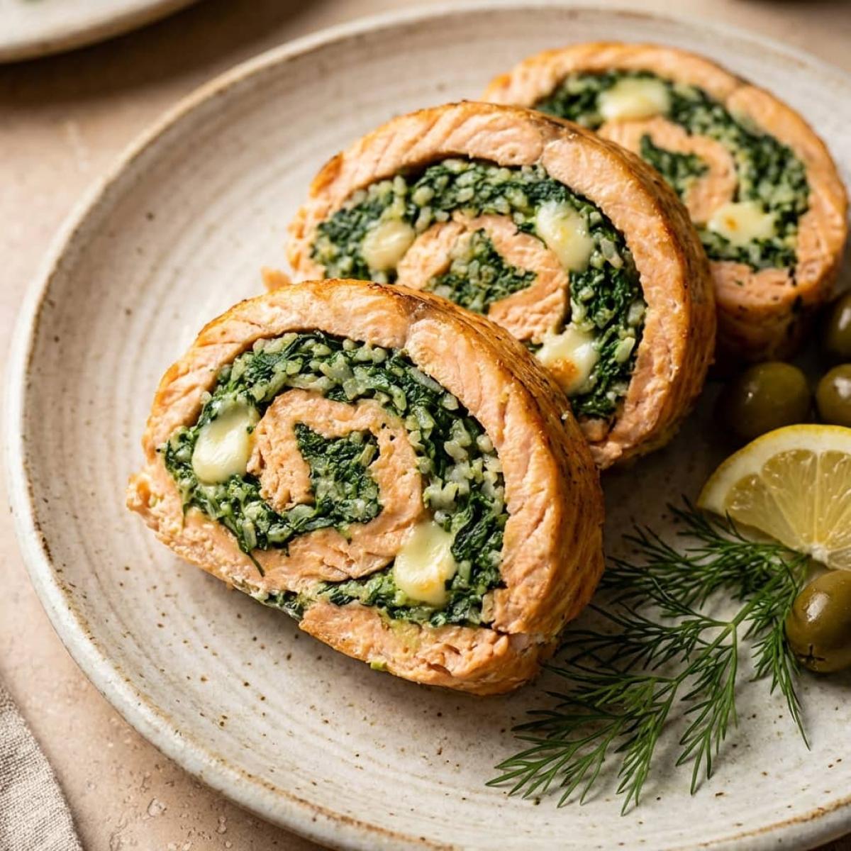 - Шпинат в этом рецепте играет не только вкусовую, но и эстетическую роль. Его яркий зеленый цвет создает красивый контраст с нежно-розовым цветом рыбы, делая срез рулета очень нарядным.