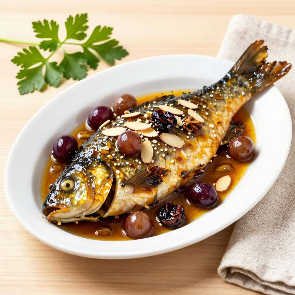 Карп в винном соусе - это полезное и питательное блюдо. Карп богат белком, фосфором, калием и витаминами группы B. Миндаль - источник полезных жиров, витамина E и магния. Виноград и изюм содержат антиоксиданты. Белое вино в умеренном количестве полезно для сердца. Это блюдо - отличный выбор для здорового и изысканного ужина.