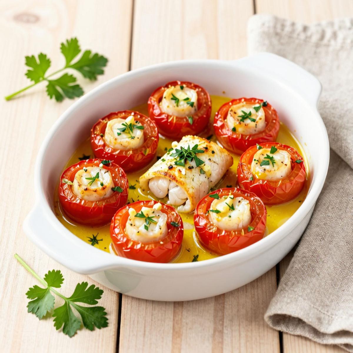 - 5. Запекание: Разогреть духовку до 180-200°C. Выложить помидоры в форму для запекания. Запекать 15-20 минут, пока рыба не станет готовой, а помидоры - мягкими, но сохранившими форму.