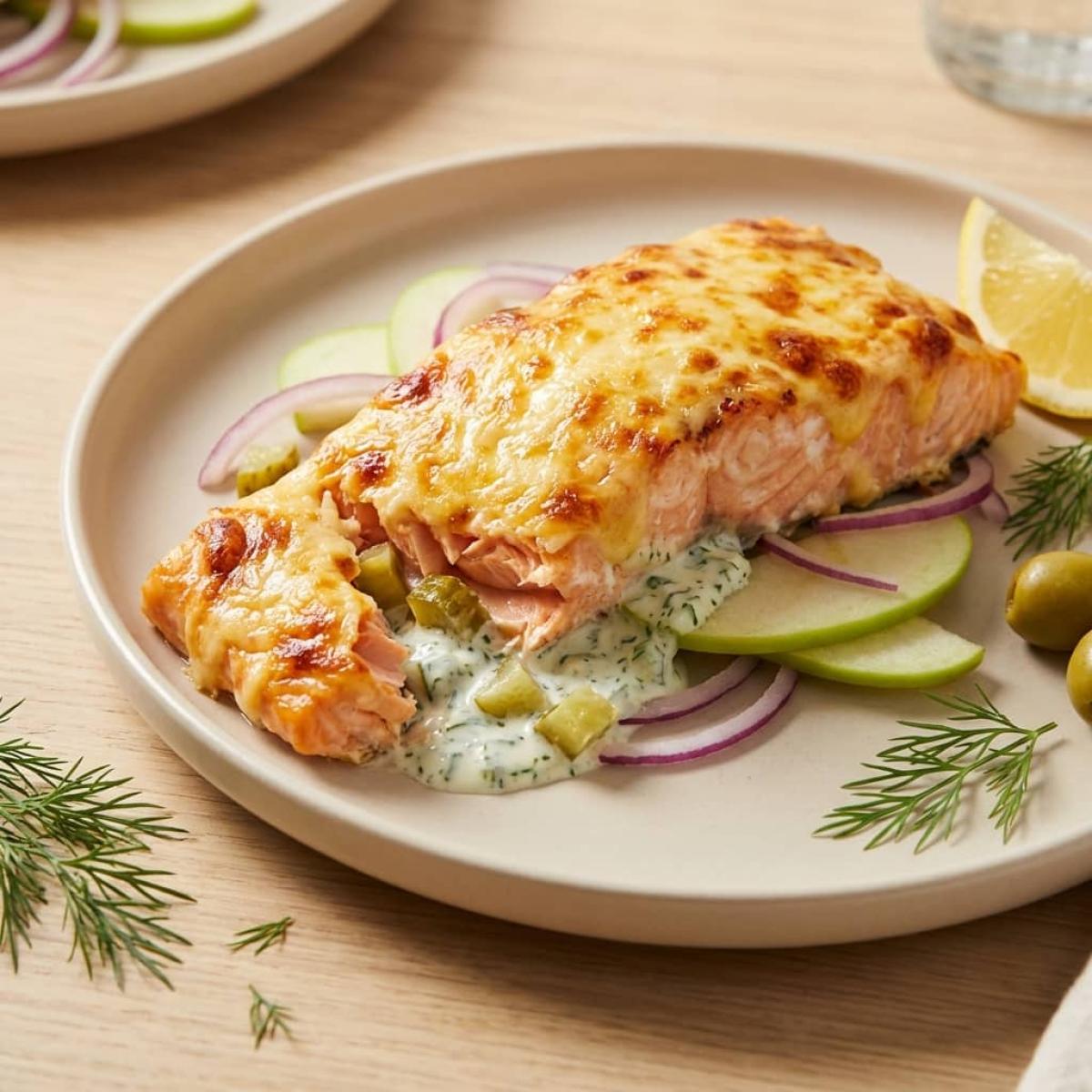Красная рыба сама по себе - деликатес, но в умелых руках она может стать настоящим кулинарным шедевром. Сегодня я хочу поделиться рецептом, который удивит вас простотой и невероятным результатом. Это семга, запеченная под оригинальным огуречным соусом. Представьте: сочное, нежное филе семги, которое томится в духовке под шубой из ароматного соуса на основе сметаны, горчицы, майонеза и, что самое интересное, маринованных огурцов. А под соусом скрываются тонкие ломтики яблока и полукольца лука, которые придают рыбе дополнительную сочность и легкую сладость. Венчает это великолепие расплавленная сырная корочка. Это блюдо - настоящая феерия вкусов: сливочная нежность, пикантная остринка, легкая кислинка и сладость. Оно станет украшением любого праздничного стола, но готовится совсем не сложно. Я подробно расскажу вам обо всех этапах, чтобы у вас получилась идеальная семга по этому рецепту.