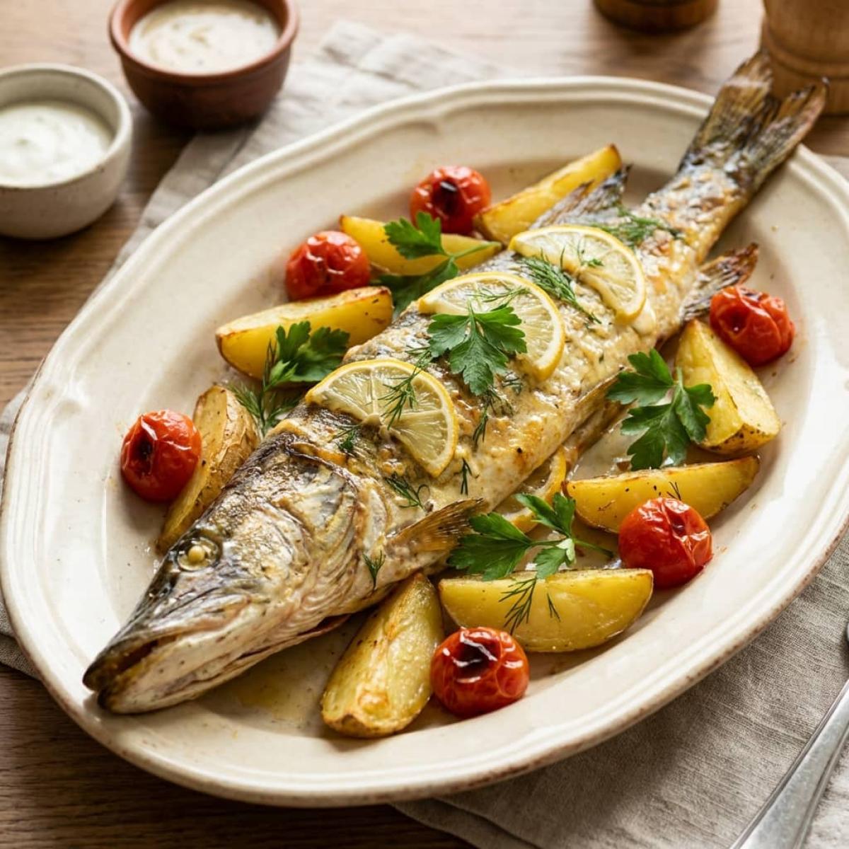 Запеченная щука с грибами - это праздничное блюдо, которое подают целиком. Выложите рыбу на большое овальное блюдо. Украсьте свежей зеленью (укропом, петрушкой), дольками лимона, веточками розмарина. Вокруг рыбы можно выложить запеченные овощи: картофель, морковь, брокколи - они будут отличным гарниром. Отдельно подайте сметану или соус (например, сливочно-хреновый). К рыбе идеально подойдут: - Отварной или запеченный картофель. - Рис с овощами. - Свежие овощи и салат из зелени. - Соленья (огурцы, помидоры, капуста). Для красивой подачи используйте целые веточки зелени, кружочки лимона и яркие овощи. Это блюдо станет центром вашего праздничного стола.