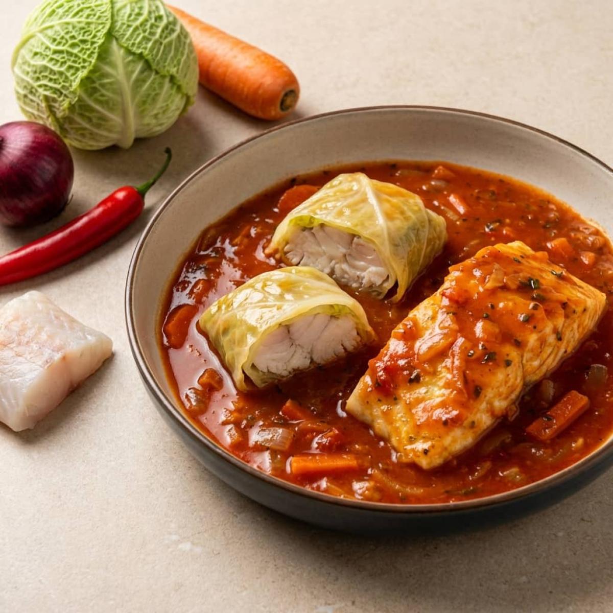 Судак - рыба благородная и очень вкусная. Его нежное, белое мясо идеально подходит для самых разных способов приготовления. Сегодня я предлагаю вам рецепт, который удивит вас своей оригинальностью и нежностью. Мы приготовим судака, тушеного в капустных листьях под ароматным овощным соусом. Представьте: сочные кусочки рыбы, завернутые в мягкие капустные листья, которые томятся в густом, пряном соусе из лука, моркови, томата и острого перчика. Капустные листья не только сохраняют рыбу от пересушивания, но и придают ей дополнительную сочность и легкий, приятный вкус. А овощной соус, пропитывая рыбу и капусту, создает настоящий взрыв вкуса. Это блюдо - идеальный выбор для здорового, диетического питания, но при этом оно настолько вкусное, что понравится всем без исключения. Готовится оно не сложно, но требует немного внимания. Я подробно расскажу вам о всех этапах, чтобы у вас получился этот замечательный судак.
