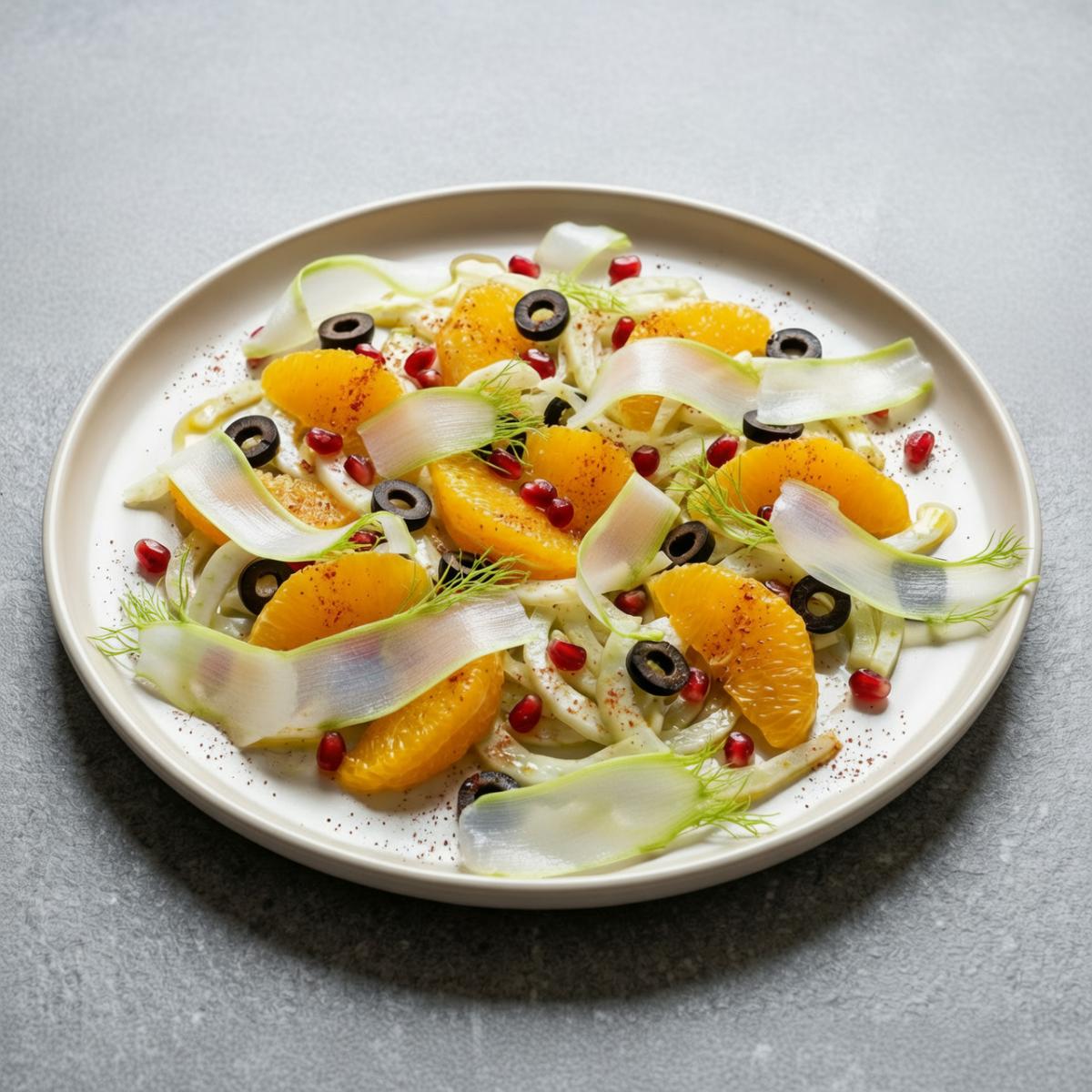 Этот салат — яркий представитель современной средиземноморской кухни, которая славится своими смелыми и гармоничными сочетаниями. Апельсины, родом из Азии, стали неотъемлемой частью европейской кулинарии благодаря арабским торговцам и крестоносцам. Фенхель, любимый еще древними греками и римлянами, до сих пор широко используется в итальянской и французской кухне. Оливки и оливковое масло — основа всего средиземноморского рациона. Гранат, символ плодородия и изобилия, пришел из Персии. Соединение этих ингредиентов в одном блюде — это кулинарный диалог культур, который мог возникнуть только в эпоху глобализации, когда продукты со всего мира стали доступны в любой точке. В России такие салаты стали популярны относительно недавно, с ростом интереса к здоровому питанию и экзотическим вкусам. Этот рецепт — пример того, как простые и полезные продукты могут создать изысканное и запоминающееся блюдо, достойное самого праздничного стола.