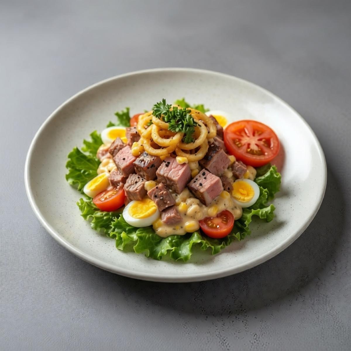 - 4. Смешивание основы салата: В большой миске соедините нарезанную грудинку, яйца, помидоры и остывший обжаренный лук.
