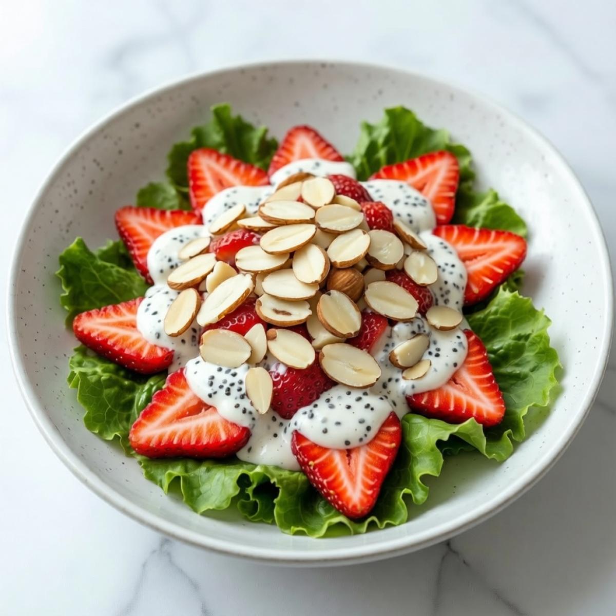 Этот салат - настоящий кладезь витаминов и полезных веществ. Клубника богата витамином C, антиоксидантами и клетчаткой. Салатные листья - источник фолиевой кислоты, витаминов и минералов. Миндаль содержит полезные жиры, витамин E и магний. Сметана и кокосовое молоко добавляют кальций и полезные жиры. Мак в небольших количествах полезен для нервной системы. Это легкое, освежающее и полезное блюдо, которое отлично подходит для летнего питания.
