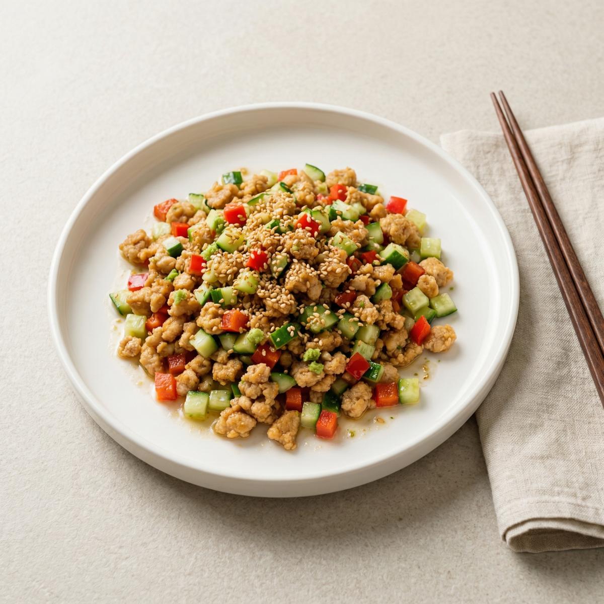 Куриный салат по-японски — это блюдо, которое я открыла для себя недавно, но оно уже успело стать одним из моих фаворитов. Сочетание нежного, слегка сладковатого куриного фарша, хрустящих свежих овощей и пикантной заправки с васаби и кунжутом — это настоящая симфония вкусов и текстур. Салат получается теплым, сытным, но при этом легким. Он идеально подходит для обеда или ужина, а также может стать оригинальной закуской на праздничном столе. Сегодня я поделюсь с вами рецептом этого замечательного салата. Мы будем использовать куриный фарш (его нужно обжарить до рассыпчатого состояния), свежие огурцы и болгарский перец. Заправка готовится на основе майонеза, рисового уксуса, сахара и васаби — она придает блюду легкую остринку и удивительный аромат. А кунжутные семечки добавляют хруст и завершают вкусовую композицию. Блюдо из японской кухни, оно получается немного острым, с освежающим, пикантным вкусом. Идеально для тех, кто любит экспериментировать.