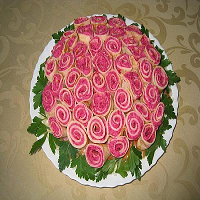 "Букет невесты" - это слоёный салат, украшенный блинчиками со свекольной начинкой в обрамлении салатной зелени. Главная задача - придать простым ингредиентам сходство со свадебным аксессуаром.1. Овощи отварить в мундире. Остудить и очистить.2. Круглое блюдо устелить салатными листьями. Филе сельди мелко нарезать и выложить на блюдо.3. Следующим слоем выложить нарезанный огурец. Затем - натёртые на крупной тёрке картофель и морковь.Каждый слой пропитать тонким слоем майонеза. 4. Смешать муку, молоко, яйцо и растительное масло. Из приготовленного теста испечь 2-3 небольших блинчика (не слишком тонких).5. Сыр и варёную свеклу мелко натереть. По желанию можно добавить зубчик растёртого чеснока. Полученную массу равномерно намазать на блинчики. Свернуть рулетом и нарезать поперёк на 3-4 части.6. Блинчики-розочки разложить в центре салата. По кругу красиво украсить зеленью.