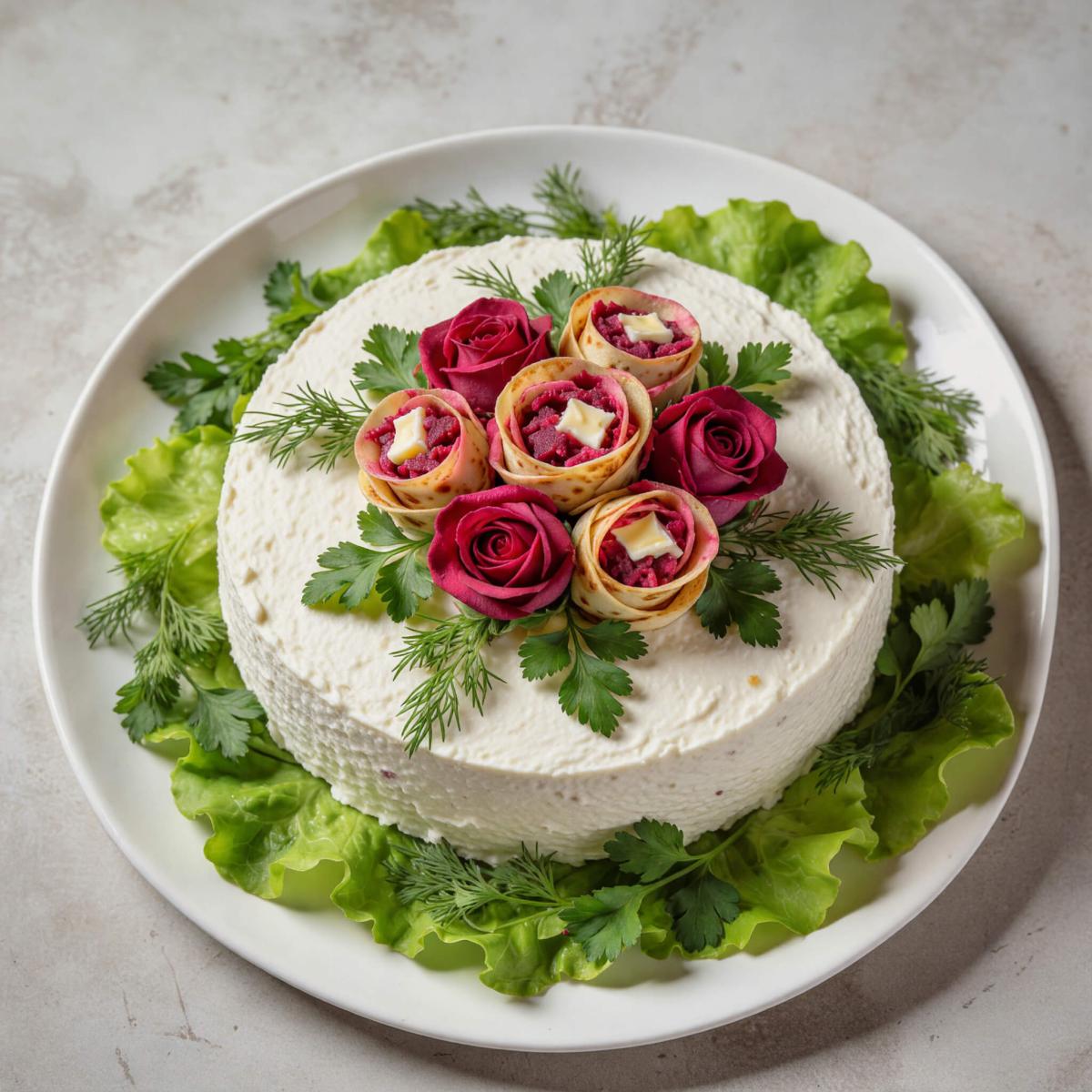 Салат 'Букет невесты' - это не просто блюдо, это настоящее произведение искусства, которое способно украсить самое торжественное событие. Нежный, слоеный, с пикантной сельдью и свежими овощами, он увенчан изящными розочками из блинчиков с яркой свекольно-сырной начинкой. Этот салат выглядит так романтично и трогательно, что его название говорит само за себя. Он идеально подойдет для свадьбы, годовщины, 8 Марта или любого другого праздника, где хочется удивить и порадовать гостей. Да, придется потрудиться, но результат превзойдет все ожидания. Я расскажу вам, как шаг за шагом создать этот кулинарный шедевр.