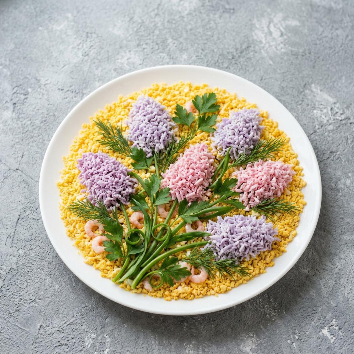 Салат «Букет сирени» — это яркий представитель современной праздничной кулинарии, где главную роль играет не только вкус, но и эстетика подачи. Он появился в 2000-х годах, когда в моду вошли красиво оформленные, тематические салаты. Идея использовать подкрашенные яичные белки для имитации цветов — это проявление народной кулинарной смекалки. Сочетание креветок с рисом и оливками — это дань популярным морепродуктам и средиземноморской кухне. Сегодня этот салат — символ весны, нежности и праздника, который с удовольствием готовят к самым разным торжествам.