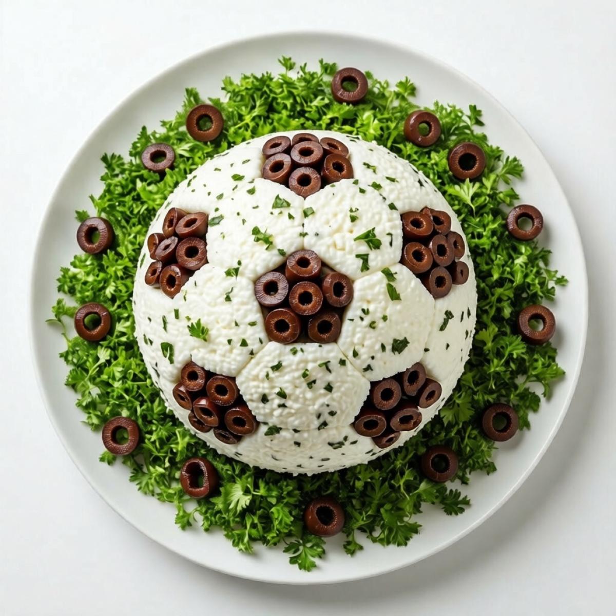 - 8. Имитация поля: Вокруг салатного «мяча» посыпьте блюдо мелко рубленой зеленью, создавая иллюзию зеленого футбольного поля.