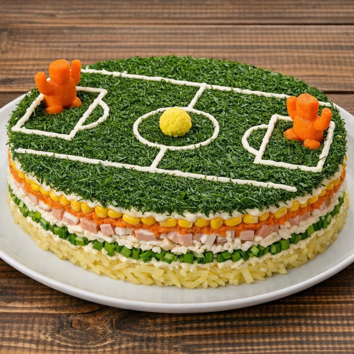 Когда приближается мужской праздник, 23 февраля или просто день рождения друга-футболиста, всегда хочется удивить чем-то особенным. Салат 'Футбольное поле' - это не просто вкусное, но и невероятно эффектное блюдо, которое сразу приковывает внимание и создает нужное настроение. Представьте: на тарелке настоящее зеленое поле с разметкой, фигурками вратарей и мячом! А внутри - сытный, нежный и любимый многими слоеный салат с ветчиной, овощами и кукурузой. Я расскажу вам, как легко и с удовольствием создать этот кулинарный шедевр, который станет главным хитом вашего застолья.