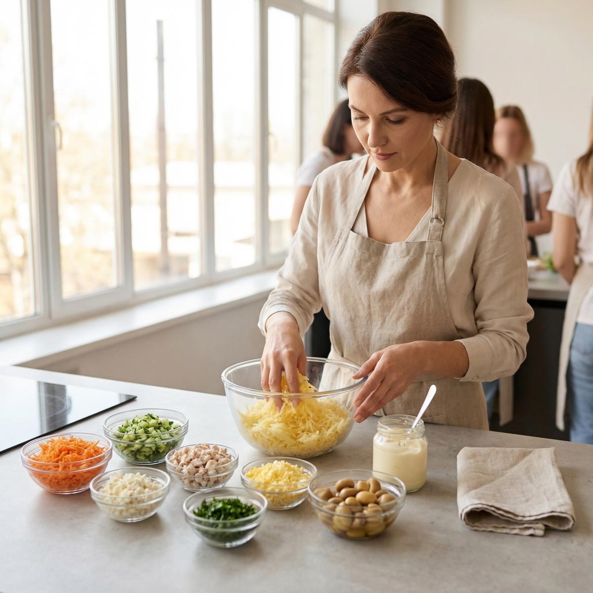 - 5. Как сделать салат более сочным? Увеличьте количество майонеза между слоями. Также можно добавить немного майонеза в каждый слой при нарезке.