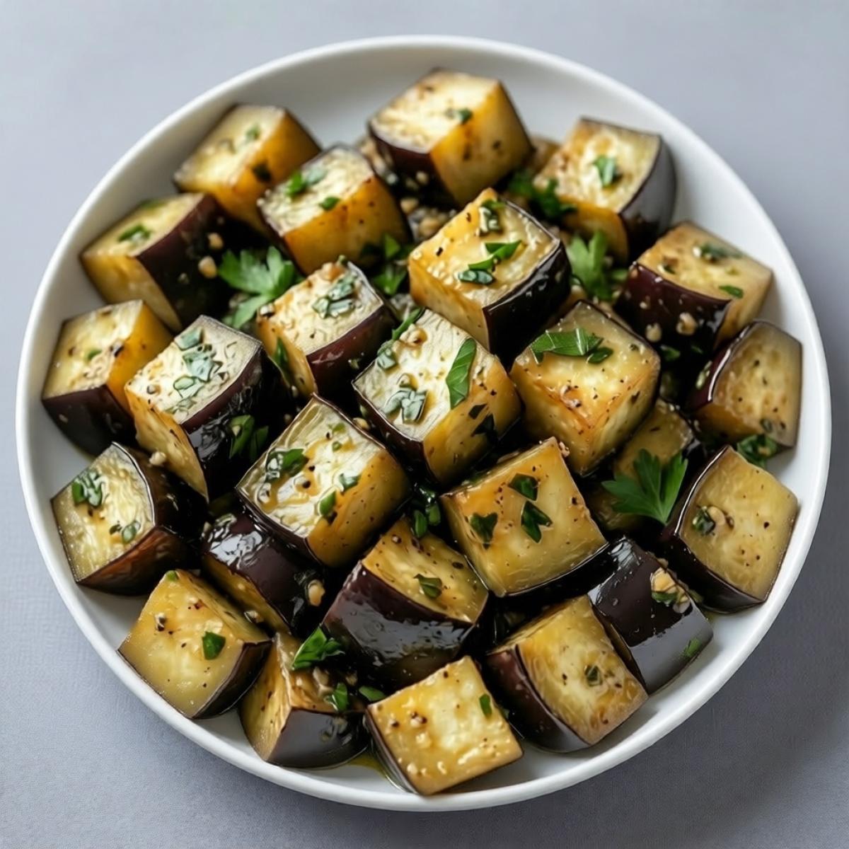 - 4. Смешивание: Добавьте в миску с заправкой нарезанные кубиками баклажаны. Тщательно перемешайте, чтобы все кусочки равномерно покрылись маринадом.