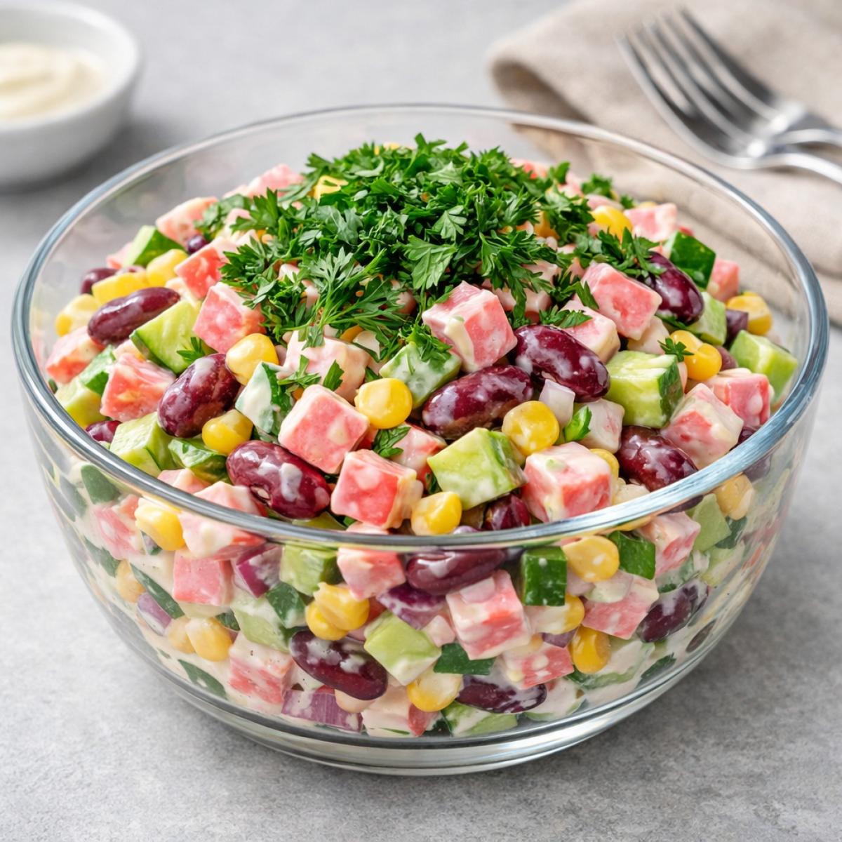 - С кукурузой: Добавление консервированной кукурузы делает салат еще более похожим на классический крабовый, но с интересной фасолевой ноткой.
