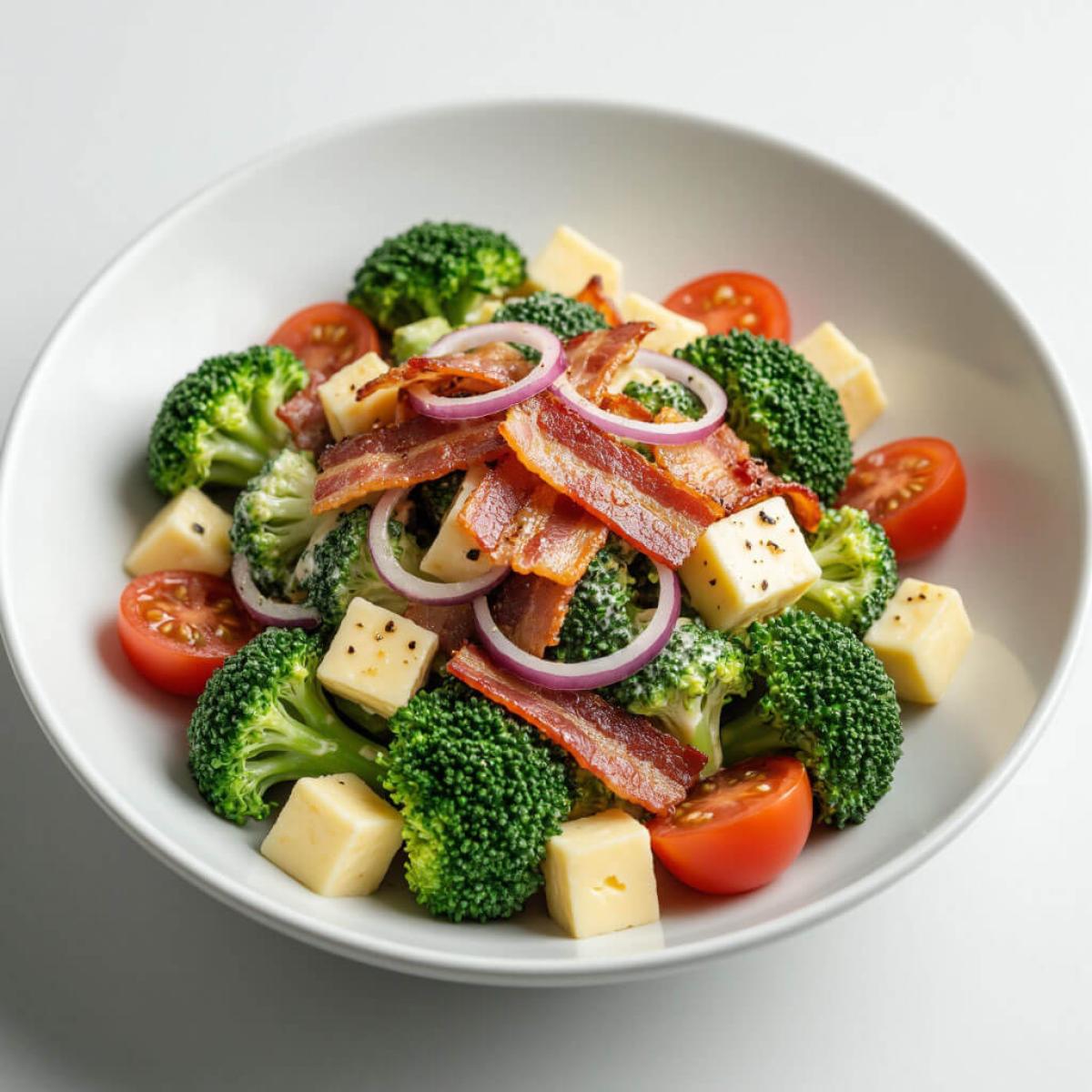 - 5. Смешивание салата: В большой салатнице соедините подготовленную брокколи, кубики бекона, кубики сыра, половинки помидоров черри и нарезанный лук.