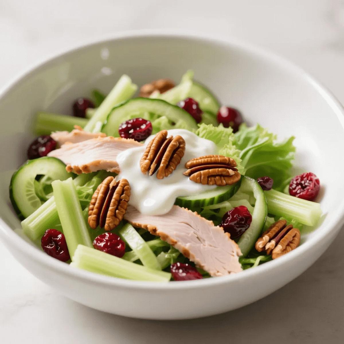 Этот салат — настоящий эталон здорового питания. Индейка — источник легкоусвояемого белка, необходимого для мышц. Огурцы и сельдерей богаты клетчаткой и водой, низкокалорийны. Яблоки — источник пектина и витаминов. Орехи пекан содержат полезные жиры и антиоксиданты. Клюква — кладезь витамина C и других полезных веществ. Заправка из сметаны и йогурта добавляет кальций и полезные бактерии. Это блюдо дарит энергию, свежесть и пользу, не перегружая организм.
