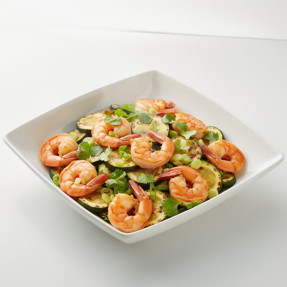 Этот салат — прекрасный пример современной интернациональной кухни, где простые продукты и техники приготовления создают изысканное блюдо. Креветки, любимые во всем мире, здесь сочетаются с популярными азиатскими ингредиентами — имбирем, лаймом, соевым соусом и перцем чили. Цукини, как универсальный и полезный овощ, отлично вписывается в эту компанию. Быстрая обжарка на сильном огне (стир-фрай) — техника, пришедшая из азиатской кухни, которая позволяет сохранить текстуру и сочность продуктов. Сегодня этот салат — отличный выбор для тех, кто ценит легкую, полезную и невероятно вкусную еду.
