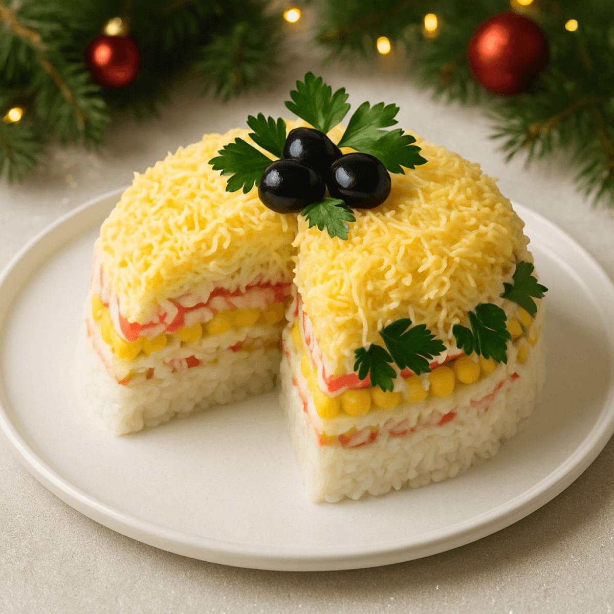 Салат-торт - это блюдо, которое всегда вызывает восторг и удивление. На вид это настоящий торт, но внутри - нежный, сытный и любимый многими салат. В этом рецепте классическое сочетание: рис, яйца, крабовые палочки, кукуруза и лук, выложенные слоями и пропитанные майонезом. А секрет формы - в том, что салат собирается в чаше, а затем переворачивается на блюдо, превращаясь в аккуратную, ровную "горку". Это идеальное блюдо для праздничного стола: красиво, вкусно и совсем не сложно. Я расскажу вам, как приготовить этот эффектный салат и удивить гостей.