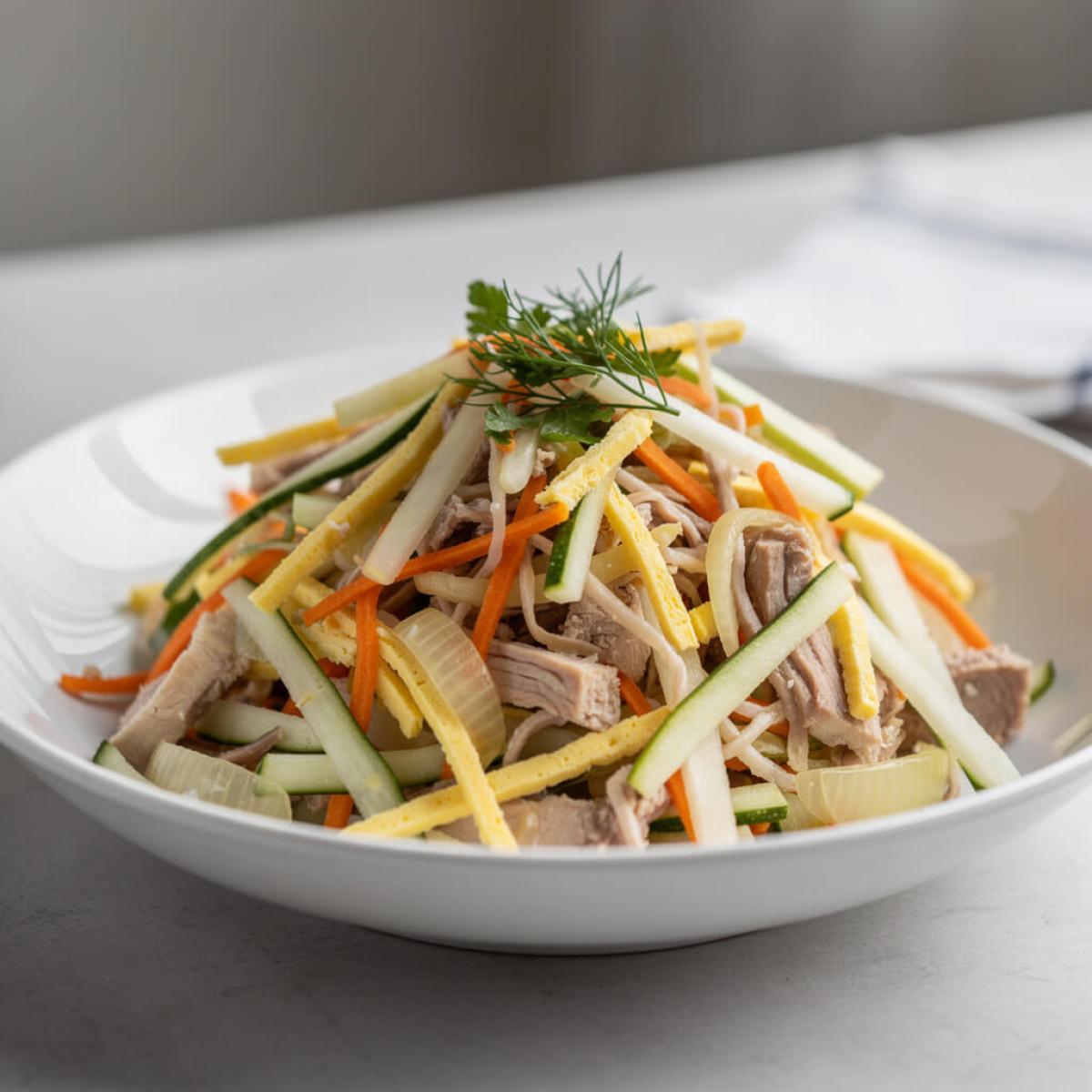 - 5. Смешивание салата: В большой миске соедините все подготовленные ингредиенты: разобранное на волокна мясо, тертую редьку, тертую морковь, нарезанные яичные блинчики и обжаренный лук.